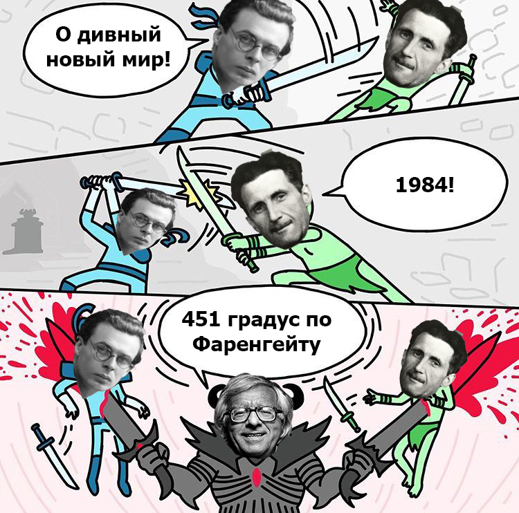 DELETED Фабрика Мемов Юмор Битва антиутопистов 5 лет назад [моё] Мемы Юмор Комиксы Антиутопия 1984 О дивный новый мир 451 градус по Фаренгейту Рэй Брэдбери Олдос Хаксли Джордж Оруэлл Ещё 0