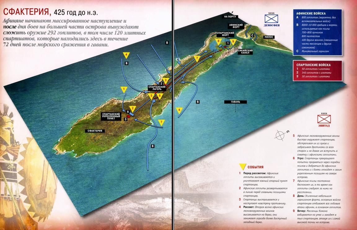 Вернемся к острову - спартанский гарнизон оказывается на нем заперт, поскольку спартанцы продули морское сражение у Пилоса. Я не буду его разбирать, потому что это флот, а про флот я знаю даже меньше чем о Пелопоннесской Войне. Но, судя по всему, остров Афинам как кость в горле. И несмотря на то, что у гарнизона безвыходное положение - спартанцы же не сдаются и с ними надо решать.