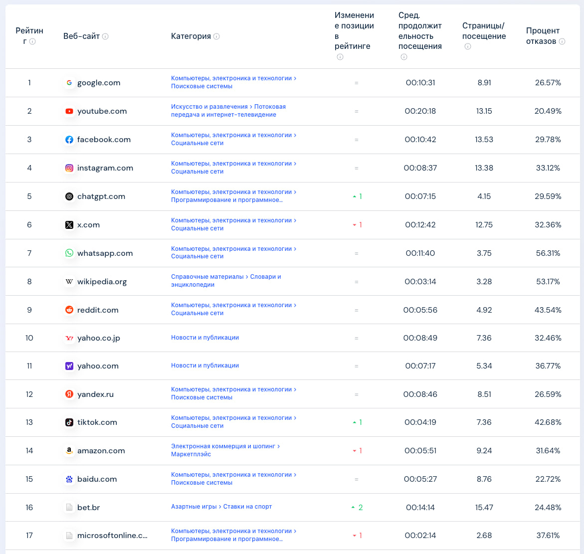 1. ChatGPT — 5,1 млрд визитов в месяц. Интересный факт — ChatGPT единственный сайт из топ-10 посещаемых сайтов мира, на котором растет трафик