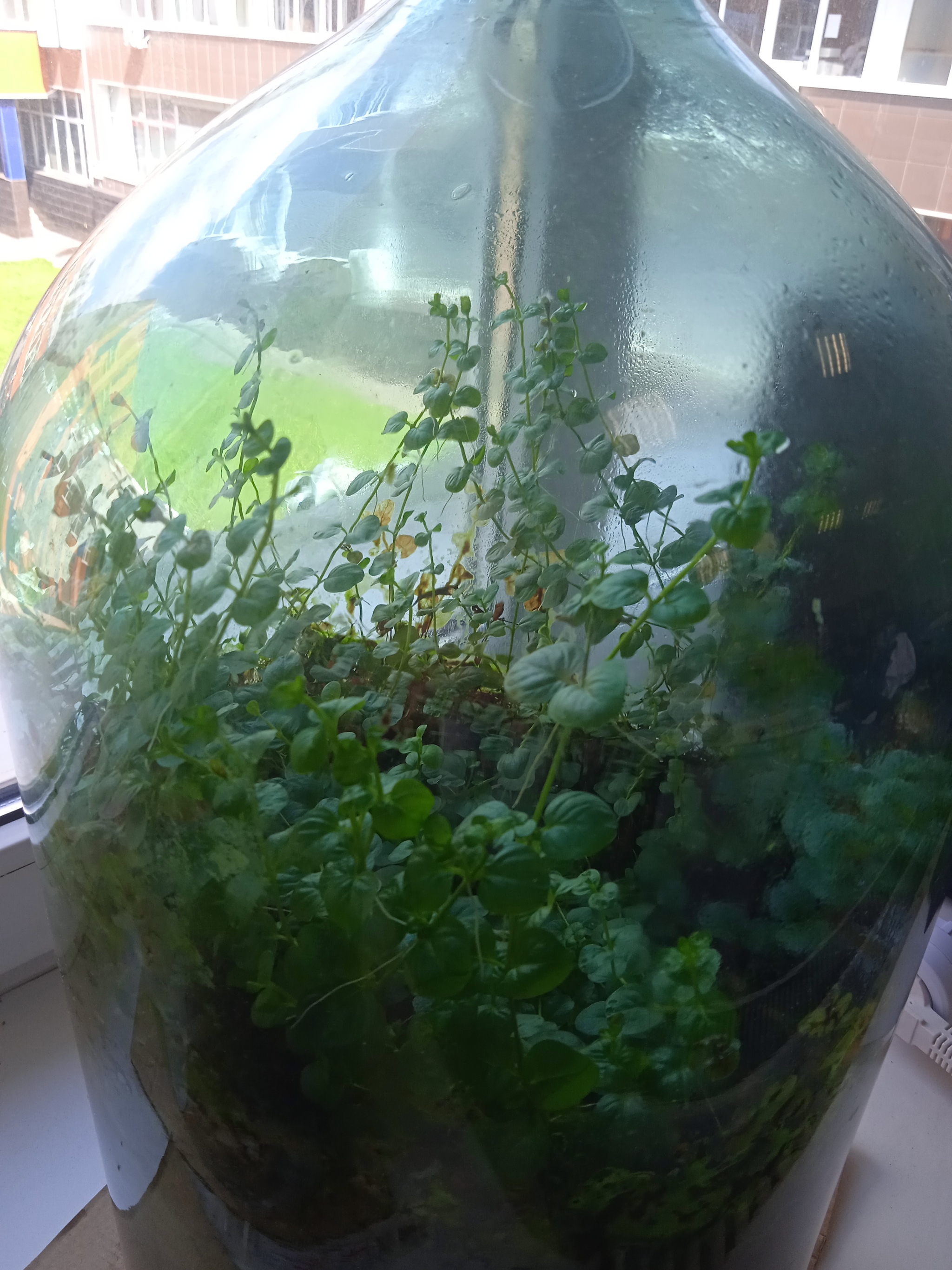 Последние три месяца в бутылке разворачивалась схватка между вербейником и плесенью. Этой весной вербейник пошёл в рост, но не так бурно, как в прошлые годы, поэтому я начала беспокоиться, что скоро плесень захватит всё. Но за прошедший месяц плесень почти ушла, а вербейник заметно подрос. Это радует - велики шансы, что зимой бутыль будет продолжать жить.