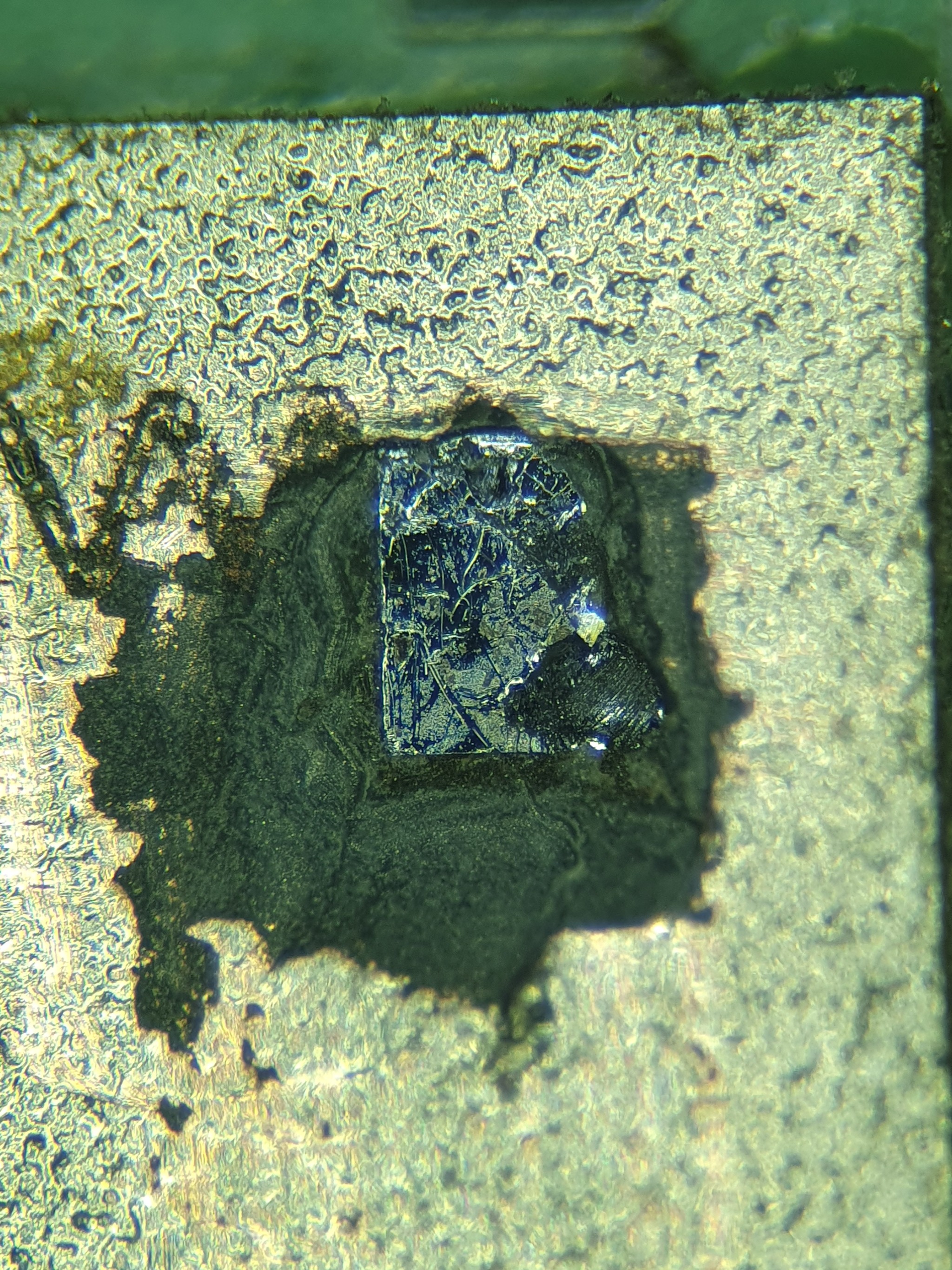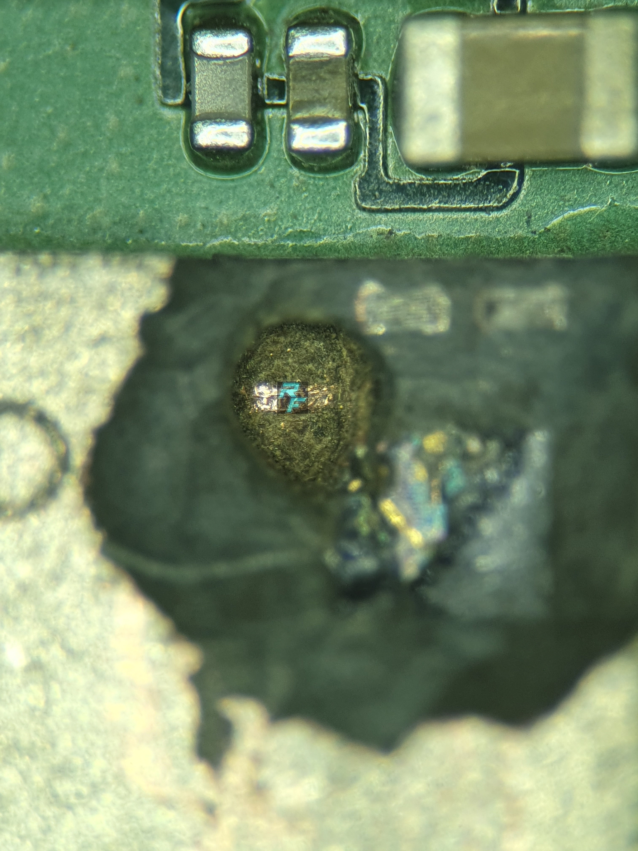 Ну понятно. Это дело под замену. Выгорело до платы. Но отпаивать я конечно же не буду, а немного поработаю микроциркуляркой. Почему не отпайка? Слишком много массовых полигонов и отпаивать тут нужно как минимум с прожаркой всей доски или локальным нагревом 360 градусов, что довольно многовато, а учесть, что плата двухэтажная и эта верхняя часть слишком тонкая - риски, что от нагрева отвалится что-то ещё. Надо отремонтировать, а не добить))