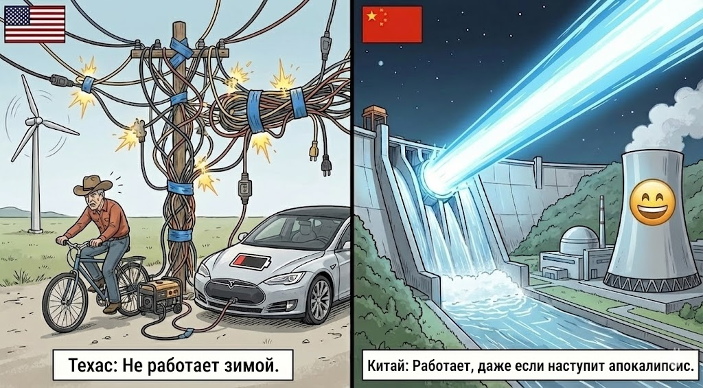 ИИ и дата-центры потребляют электричество с аппетитом Годзиллы. И здесь США ждет неприятный сюрприз. Американская энергосеть фрагментирована, устарела и трещит по швам. Любая жара в Техасе или холод на Восточном побережье ставит систему на грань блэкаута. Подключить новый гигаваттный дата-центр — задача на 5–7 лет согласований.