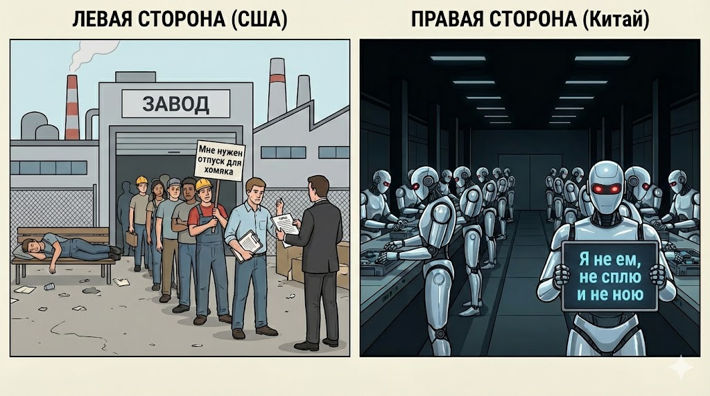 Китай строит «Тёмные фабрики». Это заводы без освещения. Роботам не нужен свет, им не нужны перерывы на обед, они не вступают в профсоюзы и не подают в суд за харрасмент. Пока Запад обсуждает этичность использования ИИ и вводит квоты на разнообразие в советах директоров, Китай массово внедряет гуманоидных роботов (Unitree и др.) на производство.