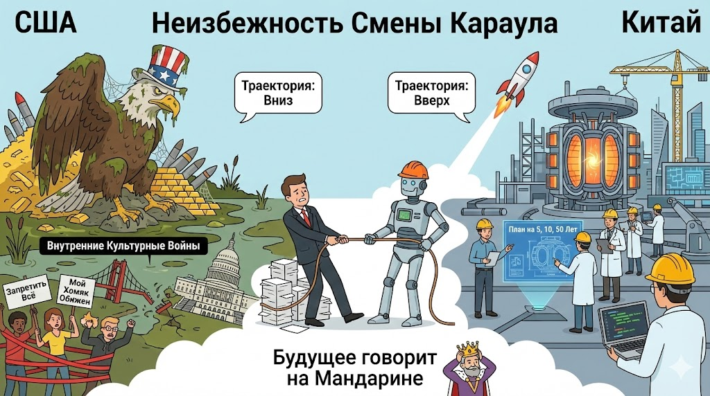США остаются мощной державой с огромным накопленным капиталом и военной мощью. Но траектория их движения направлена вниз. Страна увязла во внутренних культурных войнах, бюрократическом параличе и инфраструктурном распаде.
