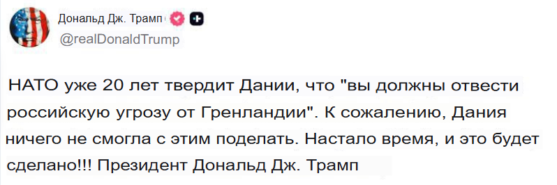 Ладно, все мы прекрасно понимаем, что "российская угроза" используется Трампом как повод для отжатия острова. (Точно также, как и "наркотики" для Венесуэлы)