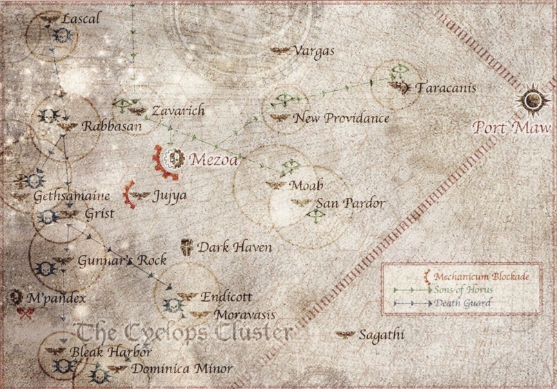 Одновременно М’Пандекс, получивший тёмные секреты Хранилища Моравеца, начал атаковать ближайшие колонии, посылая в бой невиданные ужасы – когорты живых мертвецов, возвращённых в мир живых кибернетическим колдовством. На Заварише власть взяли восставшие, а Варгас и Мрачное Убежище сдались Сынам Хоруса без боя. И оказалось, что кроме Доминики Минор в Скоплении Циклопа не осталось систем, верных Трону.