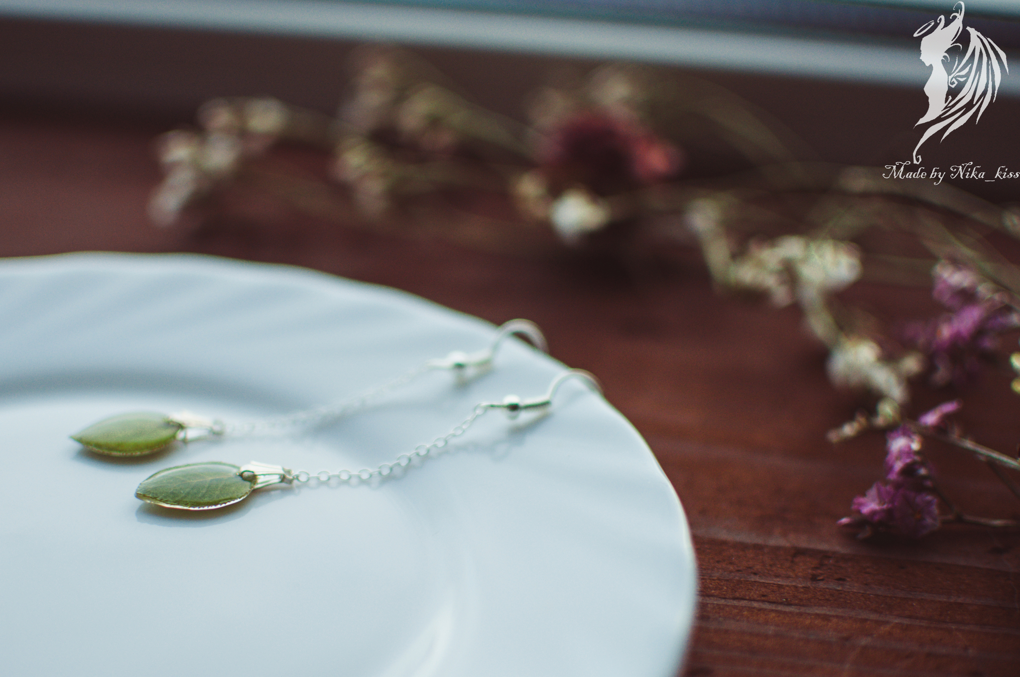 Миниатюрные листочки осины и алычи под эпоксидной смолой на тоненькой цепочке.