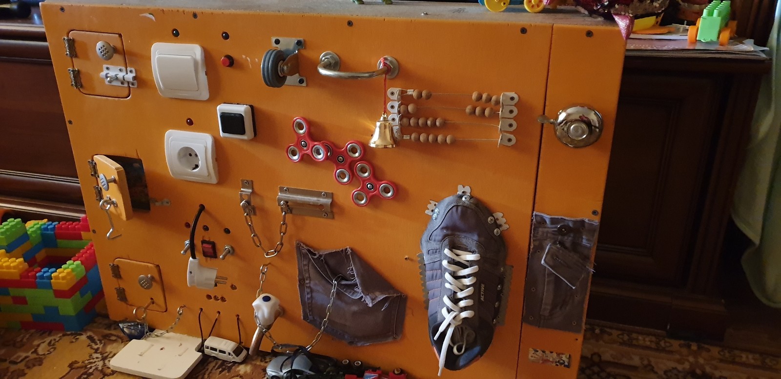 Вы, конечно, молодец, что своими руками, но бизиборд как средство развития ребёнка никакой пользы не несёт, даже наоборот. Такое количество разношерстных вещей, яркость только приводят к утомляемости малышей и препятствует формированию концентрации.
