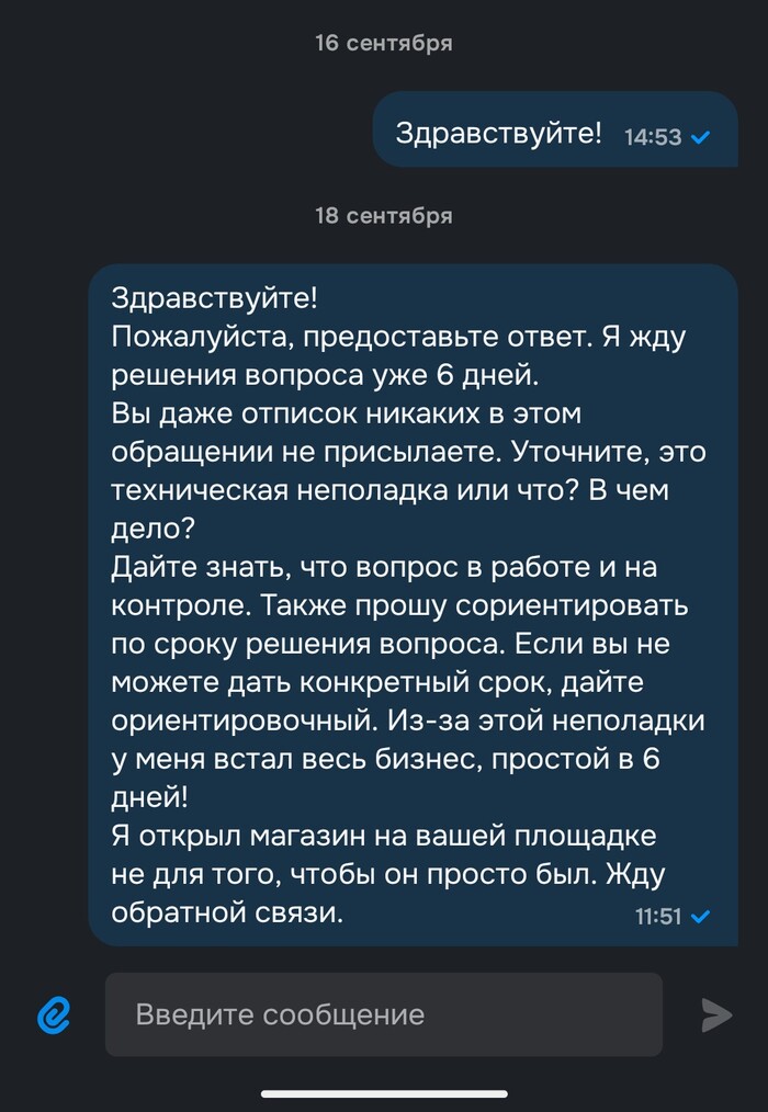 Прошла уже неделя без ответа. Магазин открыт, товары загружены, а продаж нет. Деньги уходят на хранение, время теряется, и бизнес фактически встал на паузу.