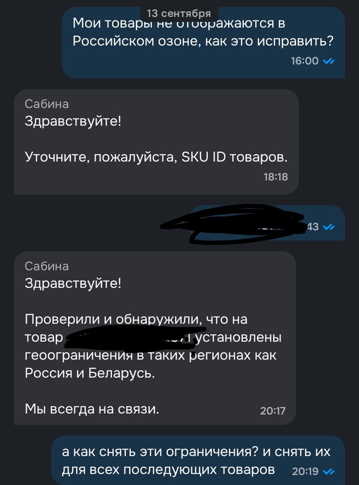 На запрос сказали: «У вас установлены региональные ограничения (а кто их установил и зачем? И как мне, как продавцу, вообще узнать о таких ограничениях?)».