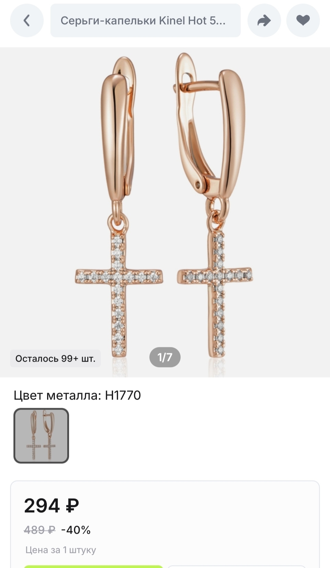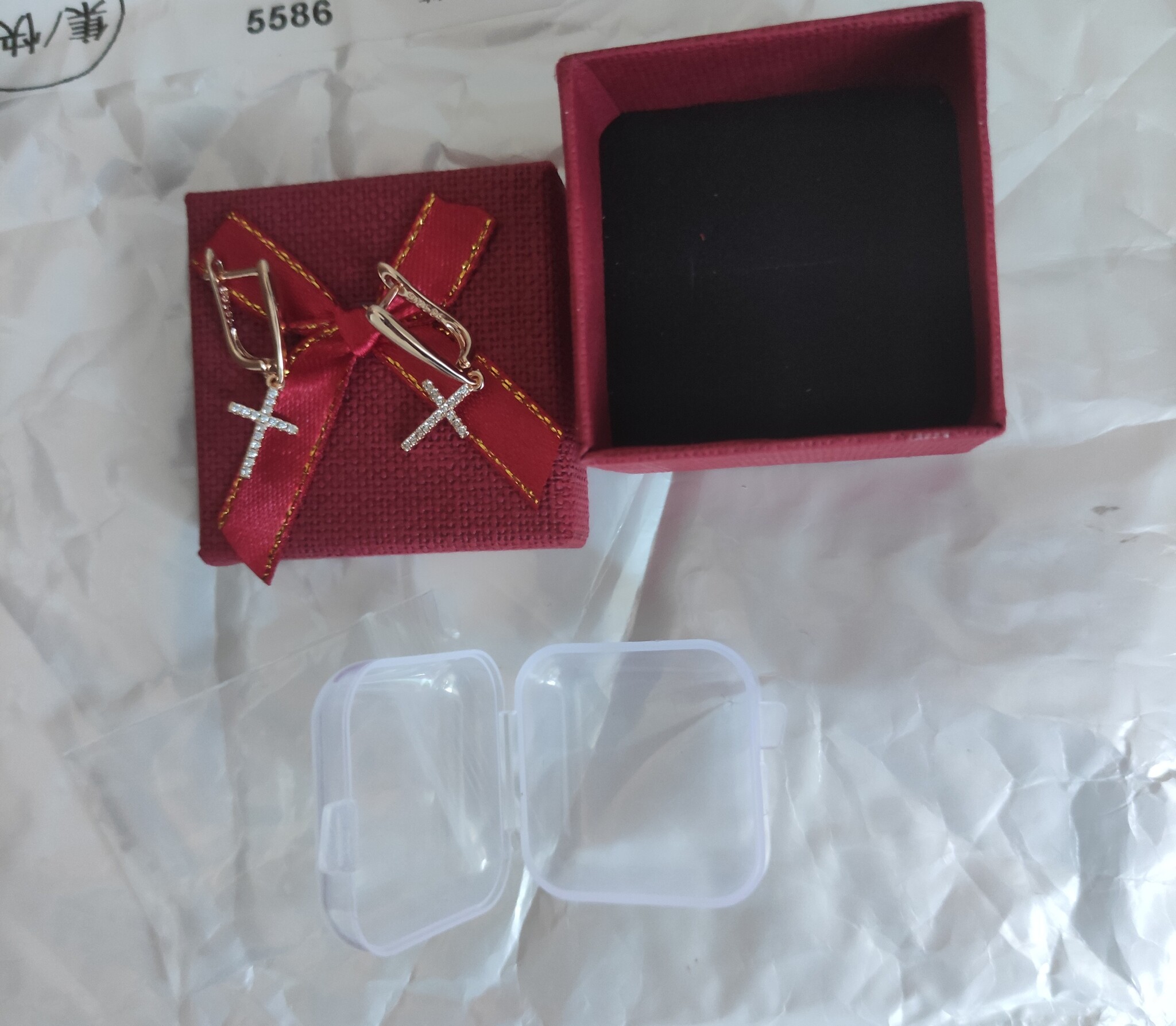 Мой взгляд пал на бижутерию хорошего качества. Не дорогие украшения которые пользуются спросом на Нашем рынке. Примеров таких продаж достаточно на площадке Авито. А на китайских маркетплейсах такой бижутерии в сотни раз больше, так что выбирать есть из чего. Учитывая мой очень ограничены бюджет выбор был сделан. Это серёжки в виде крестиков и подарочная коробочка: