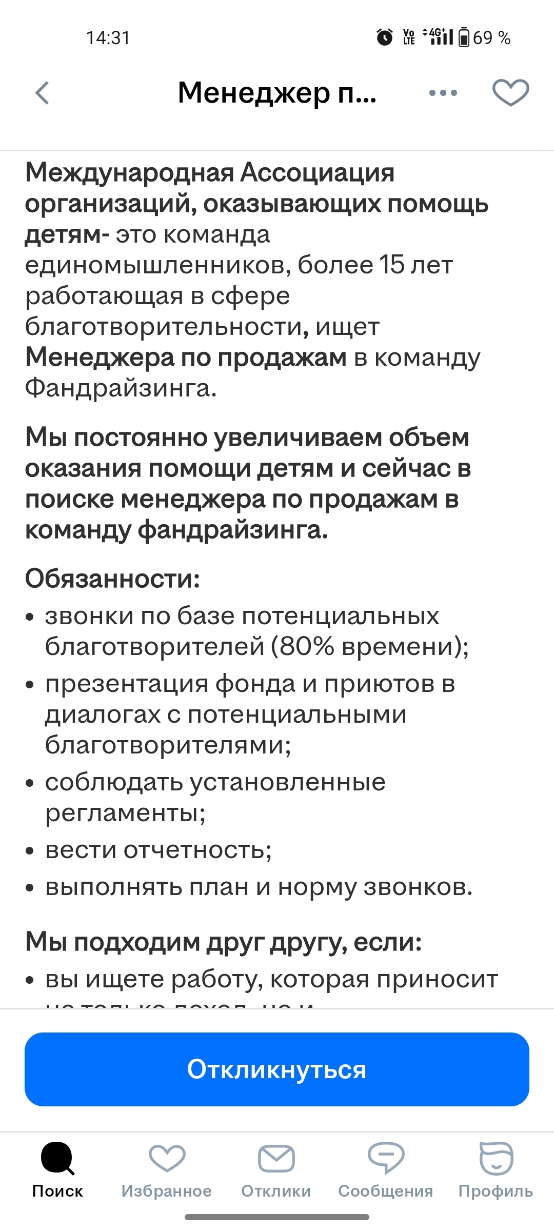 Сейчас нахожусь в поиске работы, вот на такую вакансию наткнулся, я понимаю что в фондах работают люди и у них есть зарплата, но не менеджеры же по продажам! По этому не удивительно, что многих раздражают когда им навязывают эту благотворительность! Похожую вакансию видимо в приюте для животных, не сделал скрин...клянчить донаты.