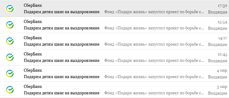 6 FreeKree Благотворительность от Сбера 2 года назад Одного письма в день мало, теперь будем слать каждый час. Адрес не левый, заголовки правильные. Ну или рассыльщик у них сломался, а не просто Сбер так офигел. Благотворительность Сбербанк Спам Ещё 0