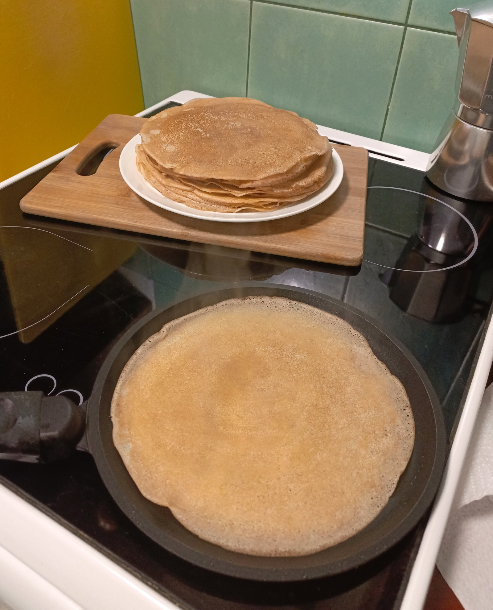 Отмечу, что хорошую сковороду с антипригарным покрытием не требуется смазывать маслом, достаточно того, что в тесте. Разве что первый раз для подстраховки можно слегка помазать кисточкой.