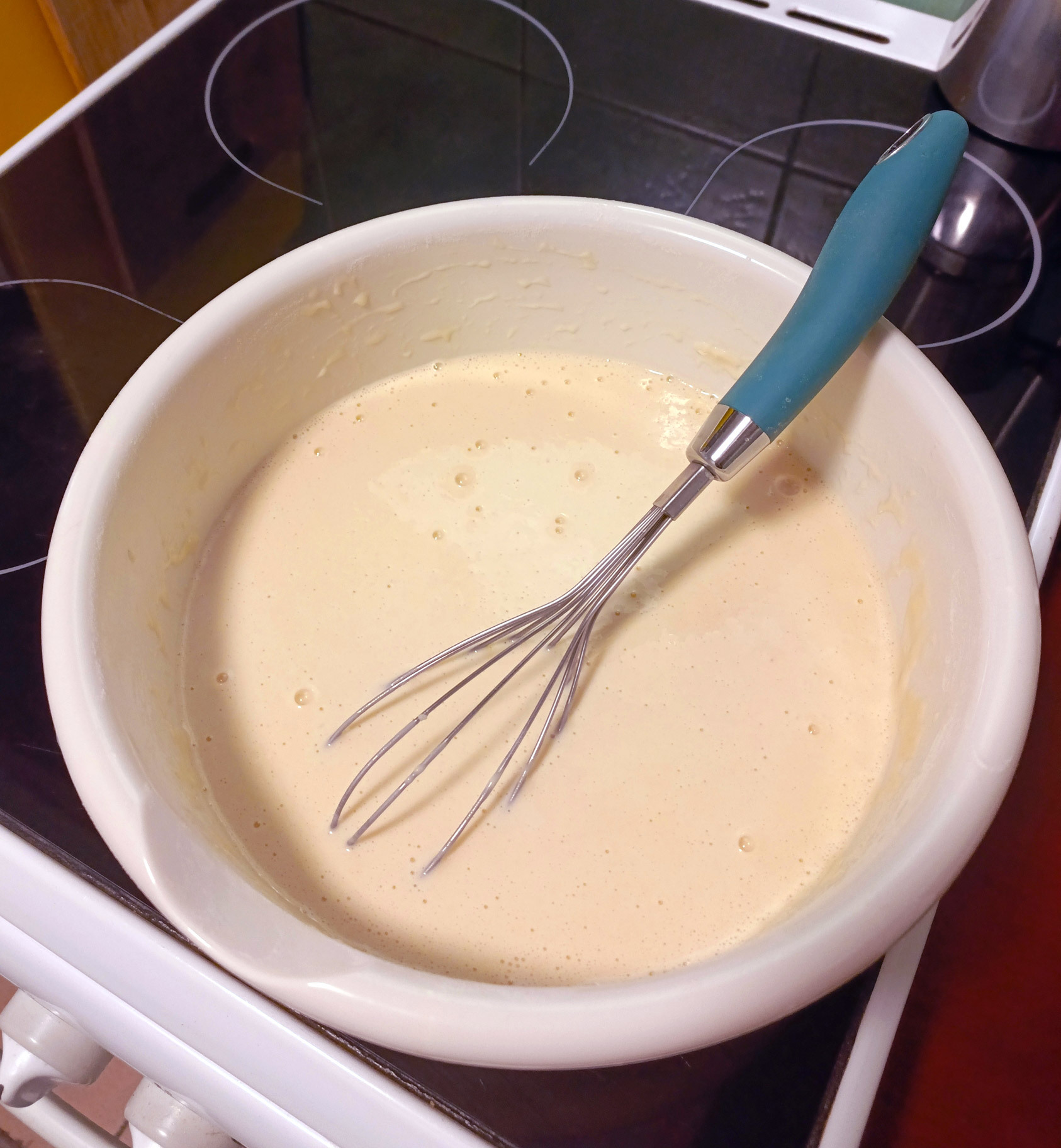 Вливаем в тесто кипяток, интенсивно помешивая венчиком. Тесто станет жидким — получится нужная консистенция для выпекания. Оставляем на десять минут, чтобы клейковина окончательно «заработала».