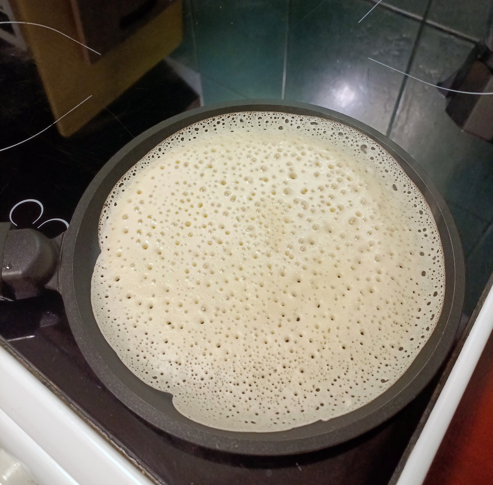 Выпекаем блинчики. Когда краешки покоричневели, а верхняя сторона стала «сухенькой», пора переворачивать. Обратите внимание, сколько прекрасных «дырдочек» на блине!