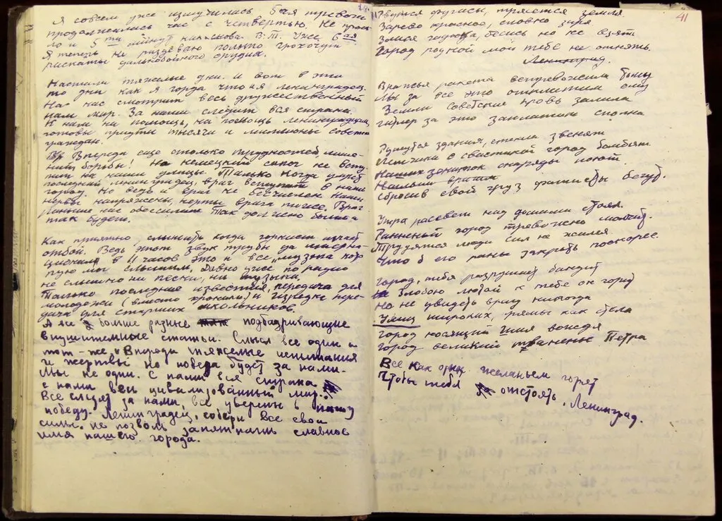 Первые месяцы дневник практически не меняется, я про настроение нашей героини: она всё также мечется из крайности в крайность, то ей очень хорошо, то очень плохо, то она (видимо, наслушавшись речей взрослых или сводок информбюро) пафосно и с неким восхищением пишет о том, как мы всех победим. И это не плохо. Это скорее признак того, что она держалась морально, как могла и за что могла.
