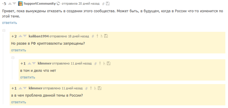 Добрый день, уважаемая администрация. Хотел бы внести предложение по созданию сообщества по криптовалюте и блокчейн технологиям. В России будущее этого вида валюты и технологии обсуждается во всех новостях и не является уже чем-то "странным и ненадежным". Статистика запросов по криптовалюте в России и во всем мире выросли в разы, что говорит о необходимости расширения знаний людей о текущем положении финансовой и технологической стороной вопроса. Если есть какая-то иерархия в сообществах, готов взять на себя обязанности) Спасибо!
