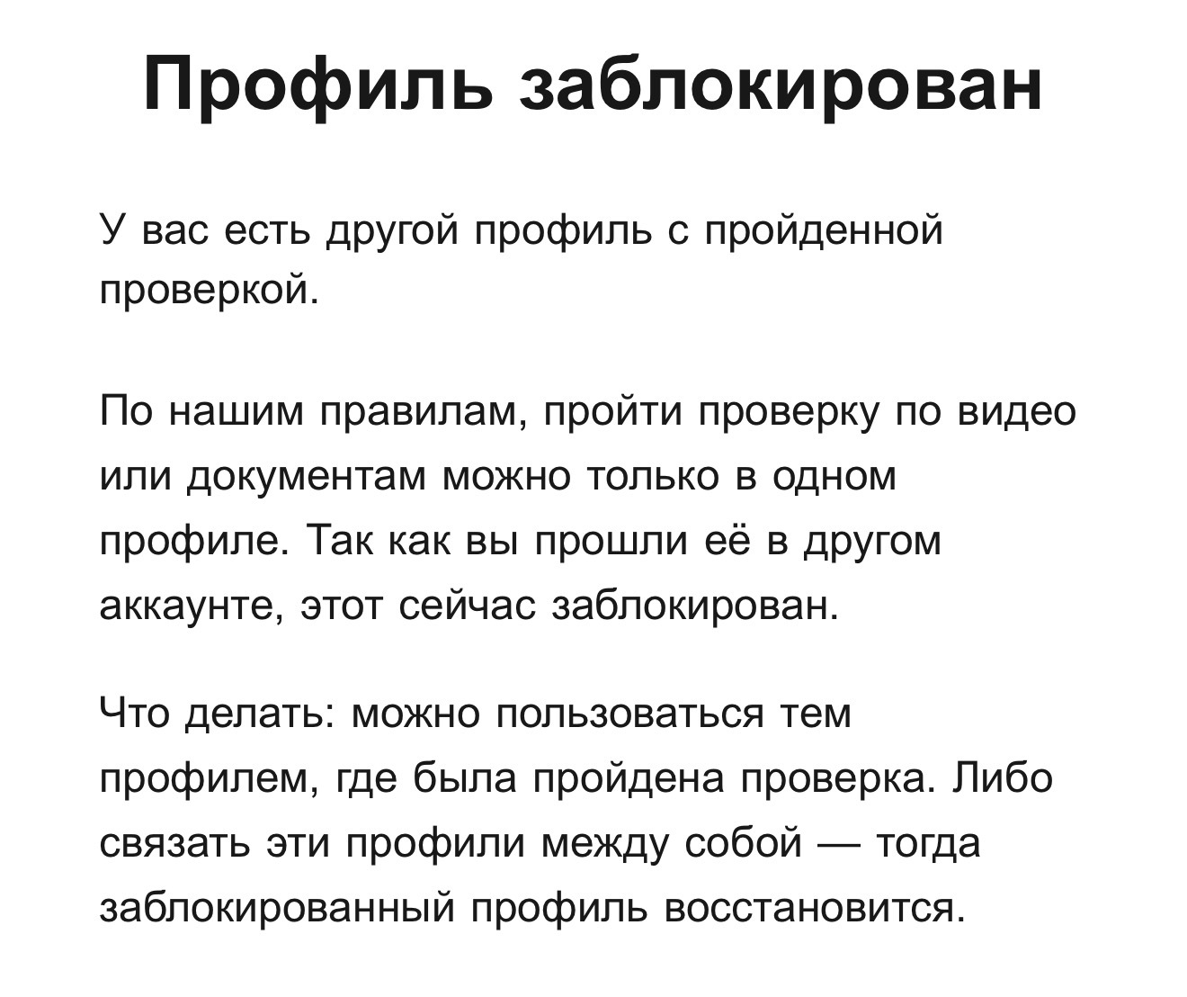 Думаю ок, время будет, разберусь, написано не беспокойтесь... Потом супруга пишет - вижу у тебя на аккаунте отрицательный отзыв, типа автомобиль не соответствует указанному состоянию, при этом авто никто смотреть не приезжал. Ну ок, думаю я, зайду посмотрю, что там. А там надпись - профиль заблокирован. Пробую зайти с компьютера, вижу надпись - пройти проверку, просит паспорт, прикладываю скан, пишет не пройдена, попробуйте еще раз, пробую еще раз, что то грузит, потом надпись - ваш аккаунт заблокирован навсегда. Пишу в поддержку - как так, почему? начинается тягомотина длиной в 2 дня, как итог: причину блокировки сказать не можем, подозрительная активность.