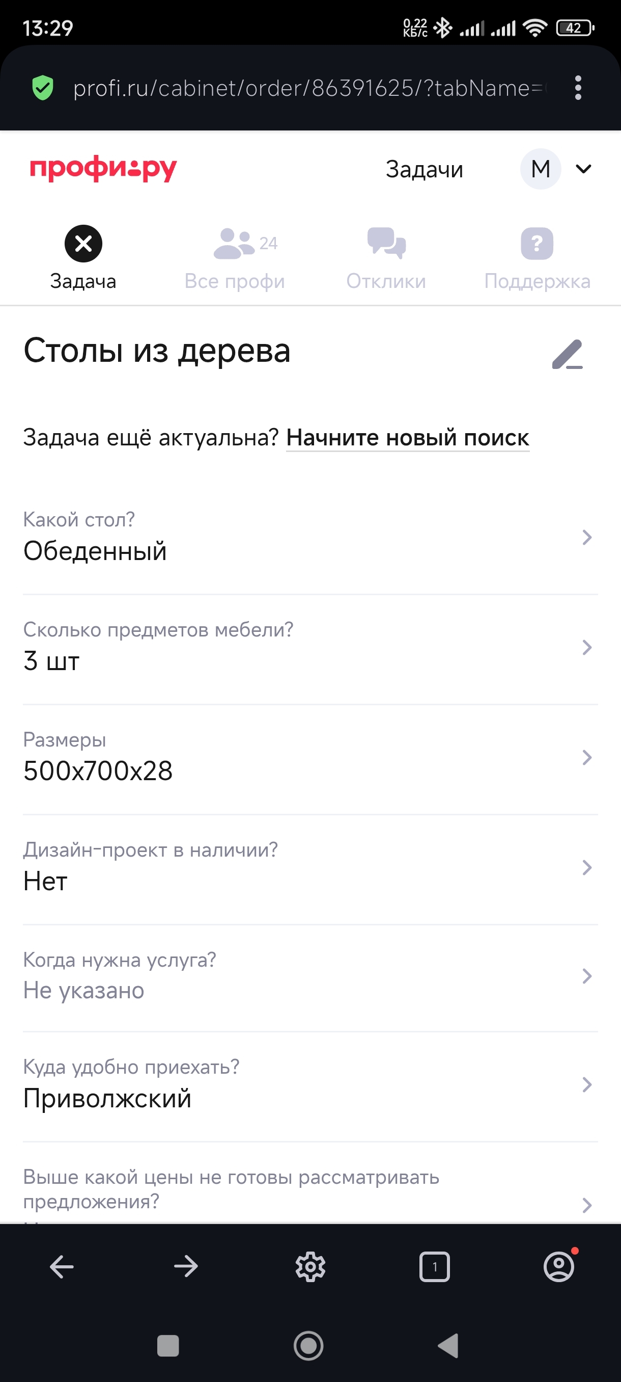 Пытался оформить заказ на обработку столешниц (удаление фаски, дерево, 3 шт.). Заявка создаётся — мгновенно блокируется.