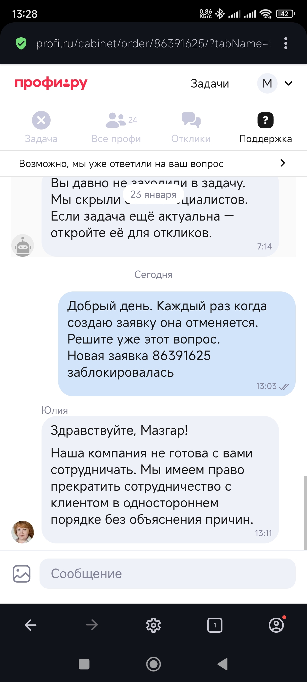 Блокировка аккаунта Profi.ru
