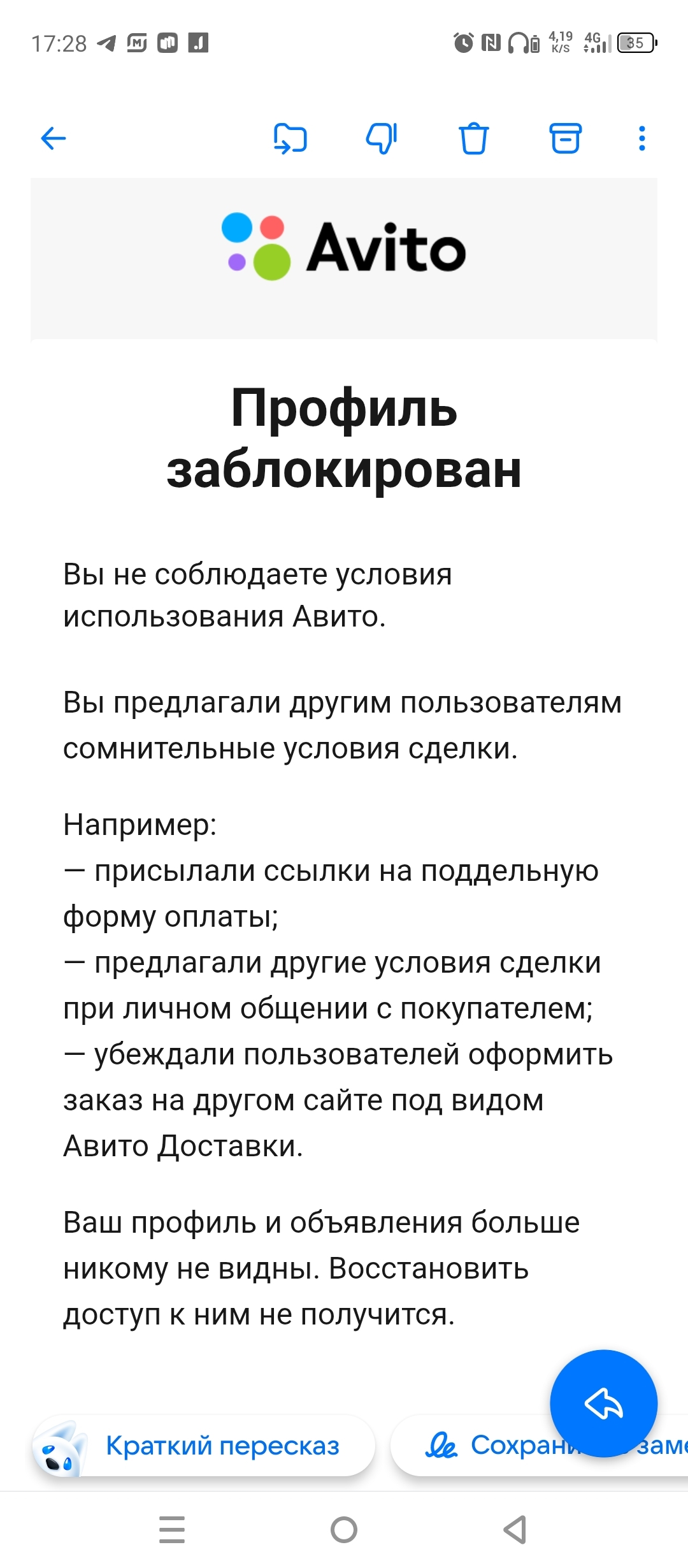 Здравствуйте, сегодня заблокировали мой аккаунт на авито, который я вела примернос 2012 года. Мой аккаунт имел рейтинг 4,9 ⭐. Было множество отличных оценок и на мой аккаунт было подписана достаточно большое количество людей. Блокировка произошла 22.08.25 ю, я писала много писем с просьбой объяснить причину блокировки, но ни одного конкретного ответа 🤷. Мне очень не приятна данная ситуация 😔. Так же у меня 3 активных заказа по отправке и один заказ был оплачен мной и теперь я не знаю как получить деньги и товар.Прошу принять меры 🙏