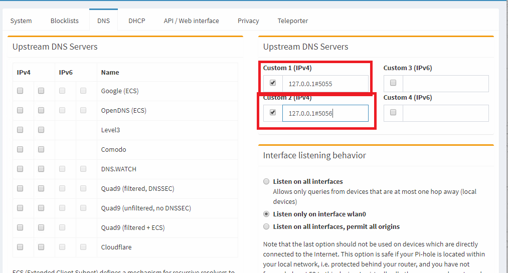 Теперь сервис cloudflare необходимо подключить к Pi-hole. Для этого заходим в веб интерфейс http://ip_address/admin/. Переходим в меню Settings — DNS, в Upstream DNS Servers убираете все галки. В custom ipv4 1 и 2 добавляете:
