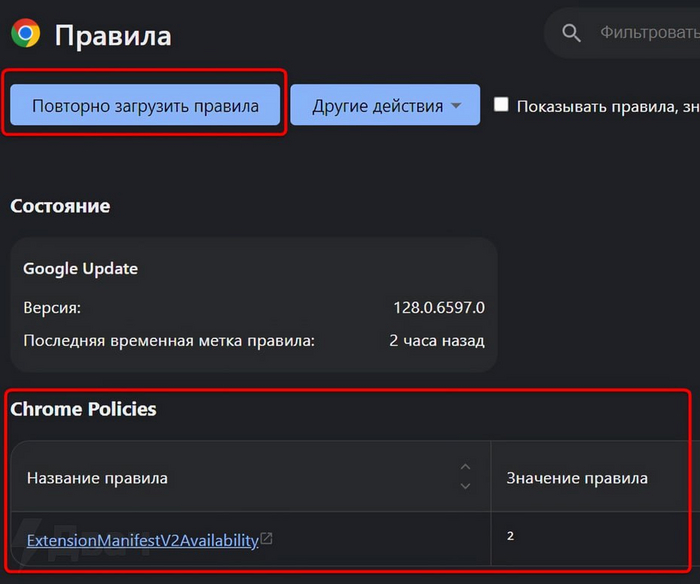 🟠Заходим в chrome://policy/ и жмём «Повторно загрузить правила».