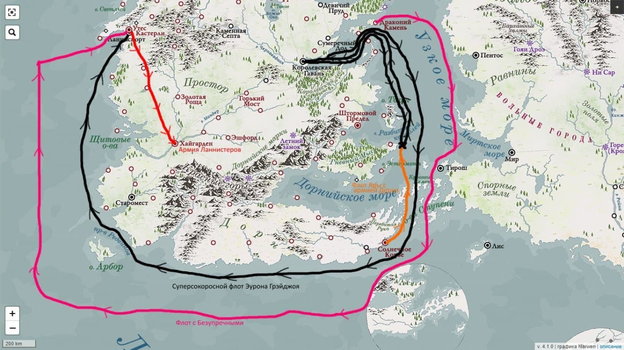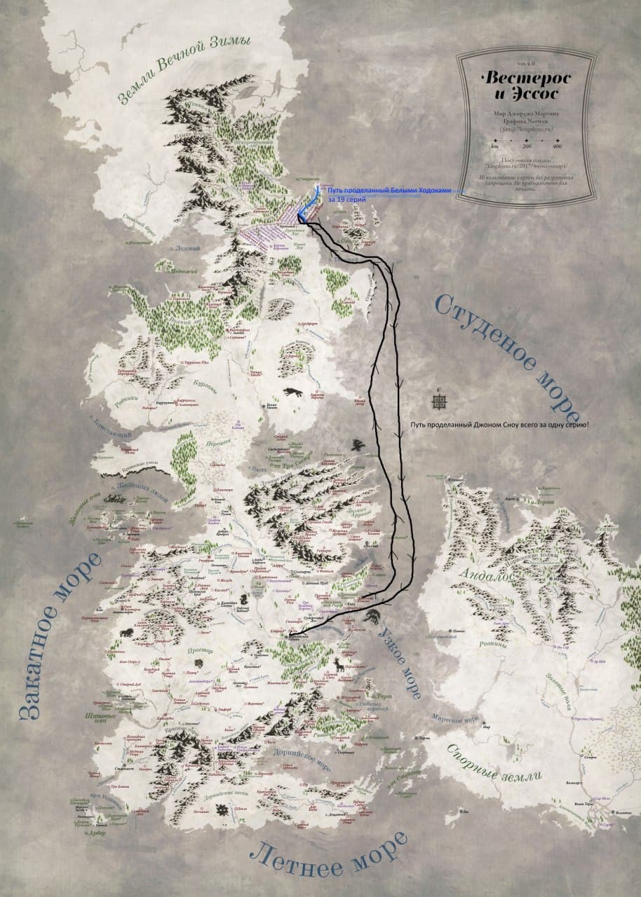 Гениально, что еще сказать. Я прикрепил карту Вестероса к этому посту и проложил на ней путь передвижения войск Дейнерис. И судя по ней, что бы добраться до Утеса Кастерли на кораблях, нужно обогнуть весь континент с юга. Если вспомнить, заявления Джорджа Мартина, что Вестерос, примерно сопоставим по размерам с Южной Америкой, то это будет нехилое такое путешествие. Ах, да, на карте еще изображены реки. Но, думаю, не стоит упоминать, насколько это глупая идея, переплавлять восьмитысячную армию через реки, на кораблях, предназначенных для морского плавания? Они же не викинги! И в том, и другом случае это крайне рисковое и долгое мероприятие — не самое удачное стратегическое решение.
