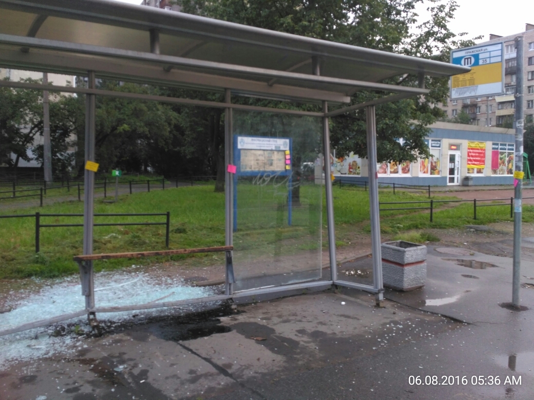 Сплю. Раздался звук удара и бьющегося стекла. Сплю дальше. Ревет периодически движок. Выглянул и вижу, что 3 человека пытаются вытащить ВАЗ классика белого цвета с ГОС номером Х045АА98. Въехал в автобусную остановку и помял и разбил её. СПб, ул. Белы Куна д. 15 к1.