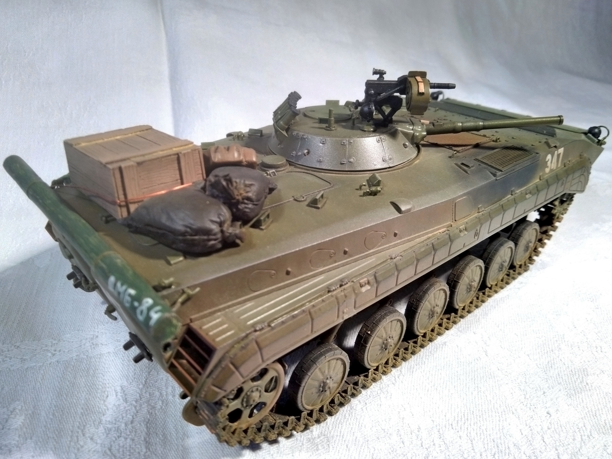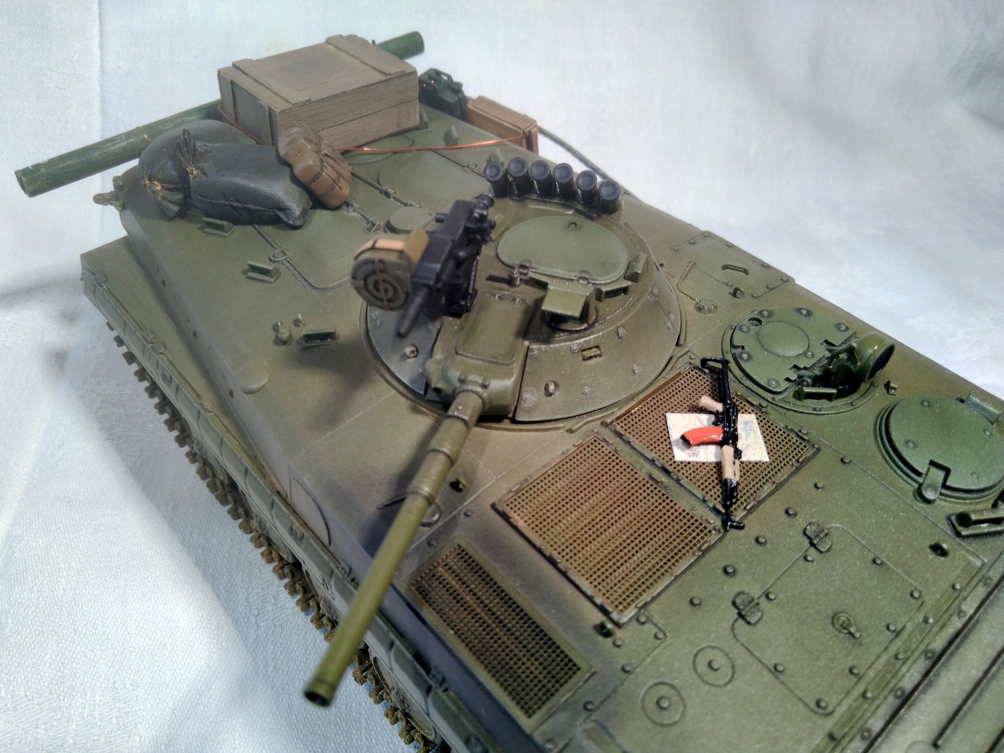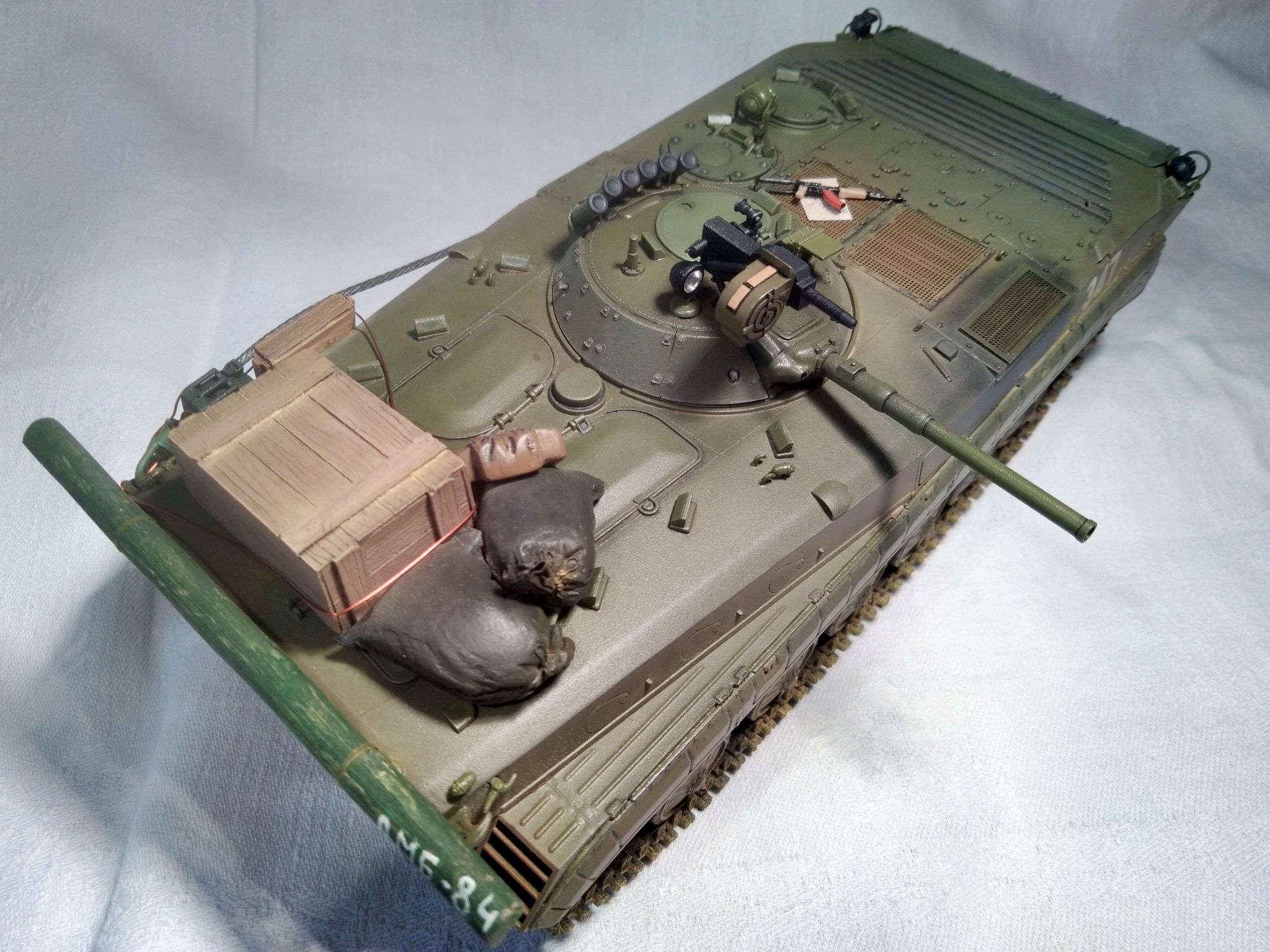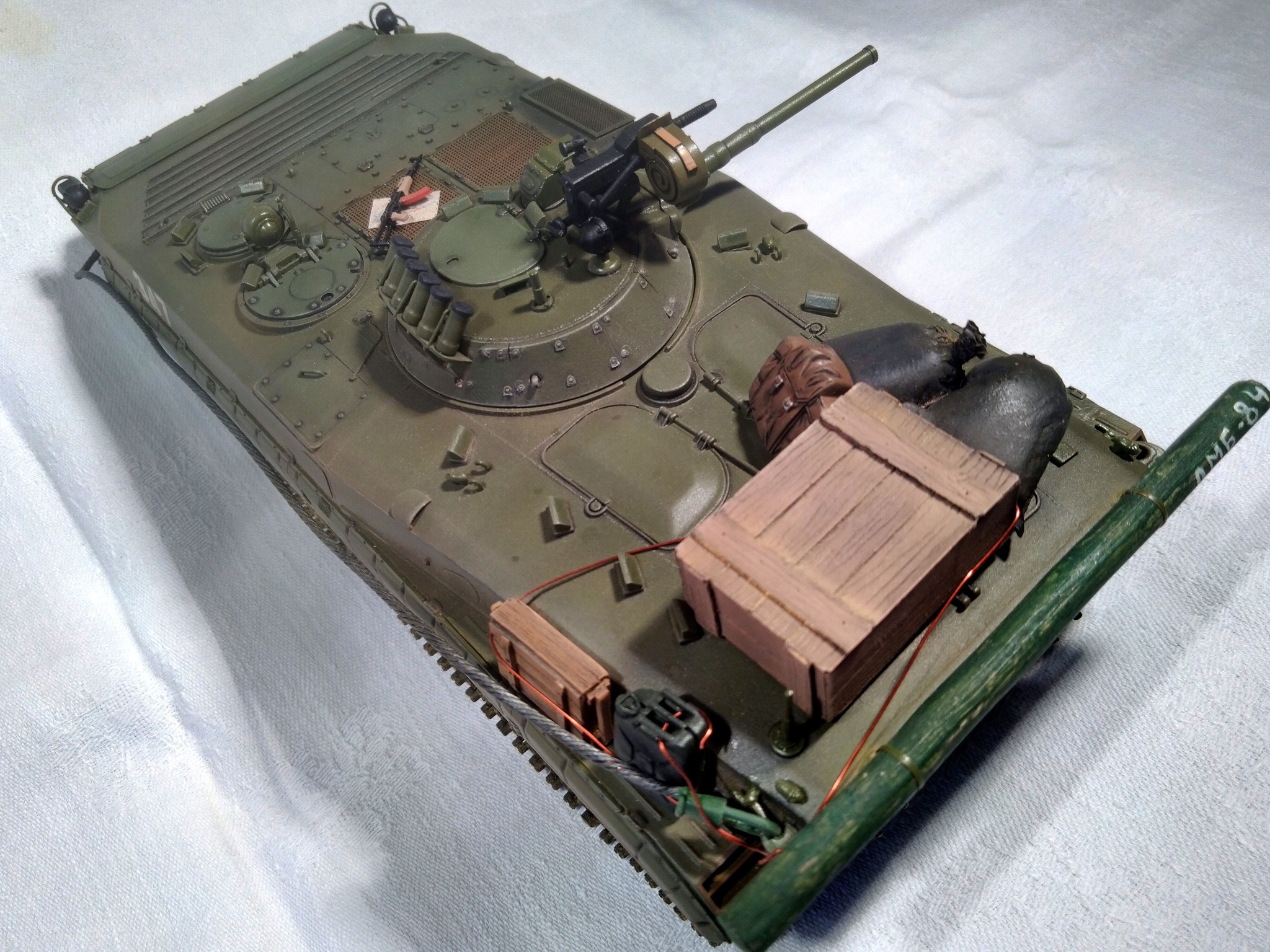 Модель - Trumpeter, химия и пигменты - Tamiya, MIG, Mr.Hobby, AK, Wilder. Дополнения (танковый трос, ящики, мешки, канистра, рюкзак, карты, АГС-17 и АКМС) - "Звезда", ICM, ZIP-maket, "Танк", ТСА. Бревно - палочка для суши. Прототипа не имеет, историческая привязка - ОКСВА, 1980-е.