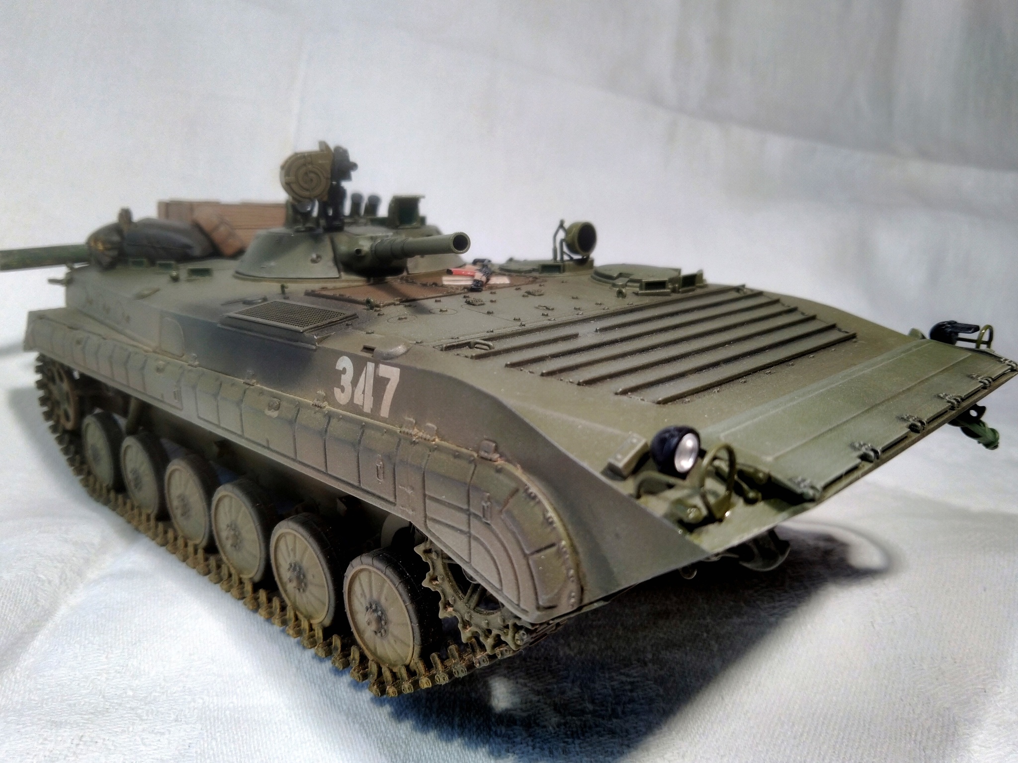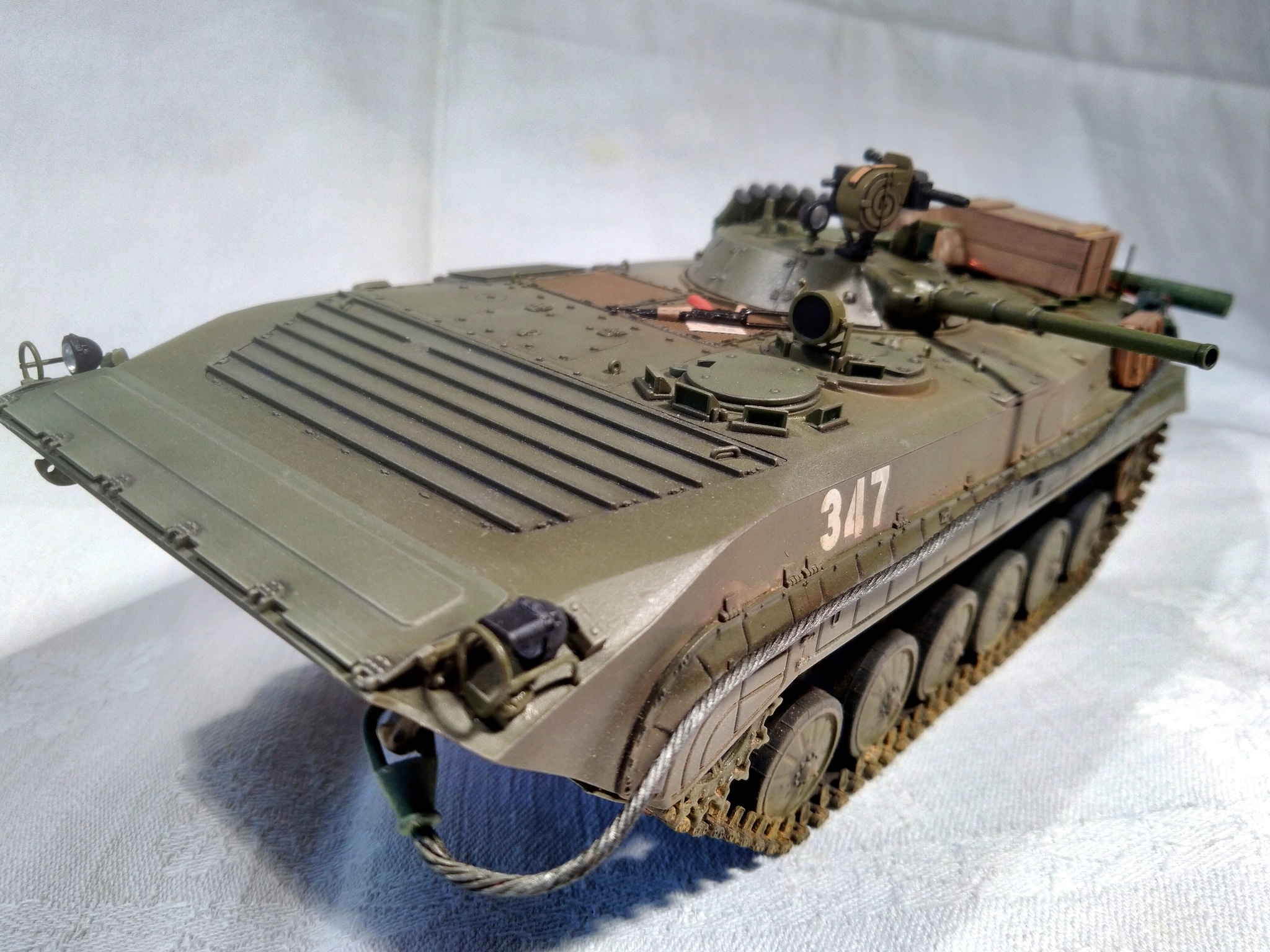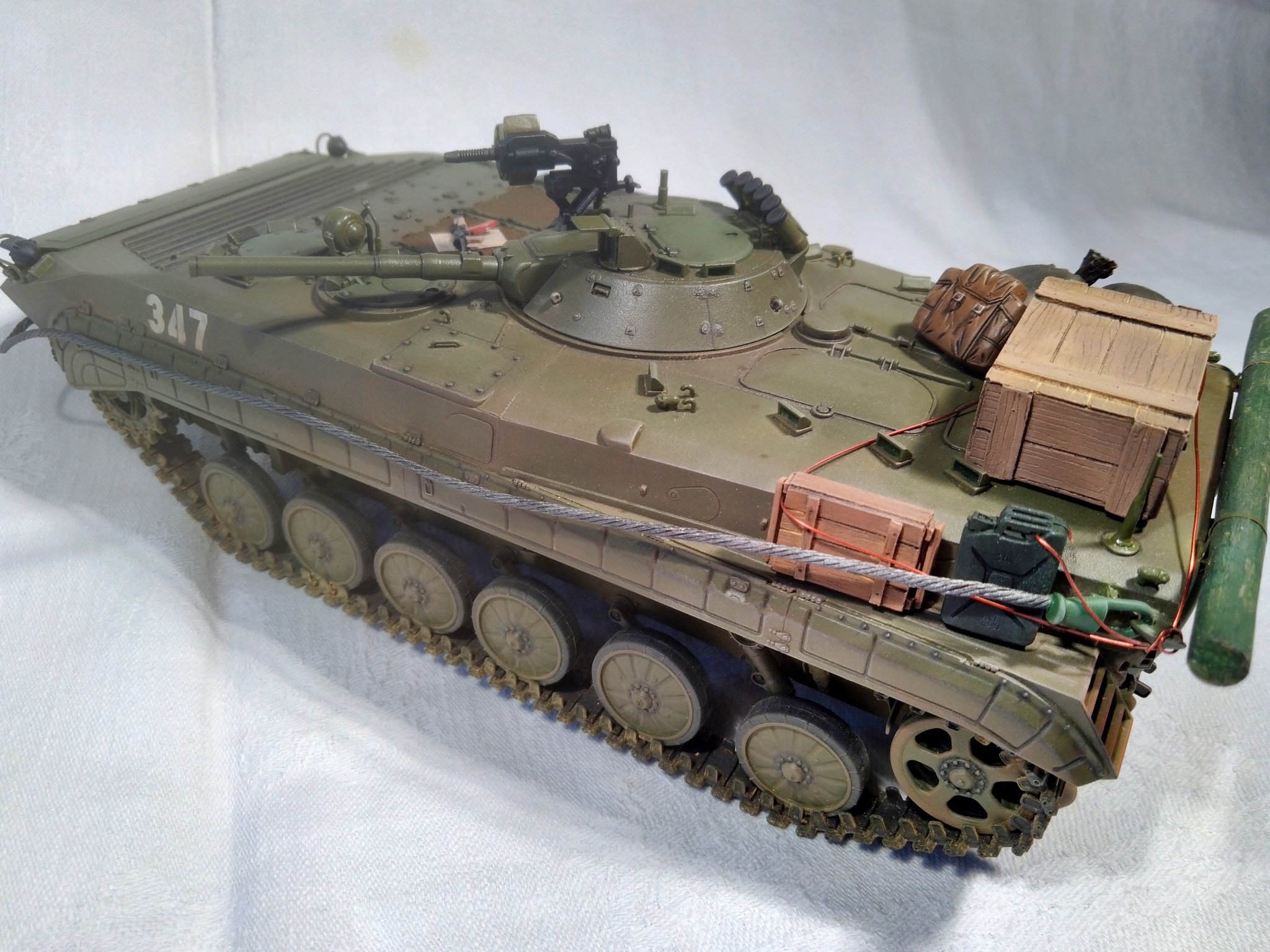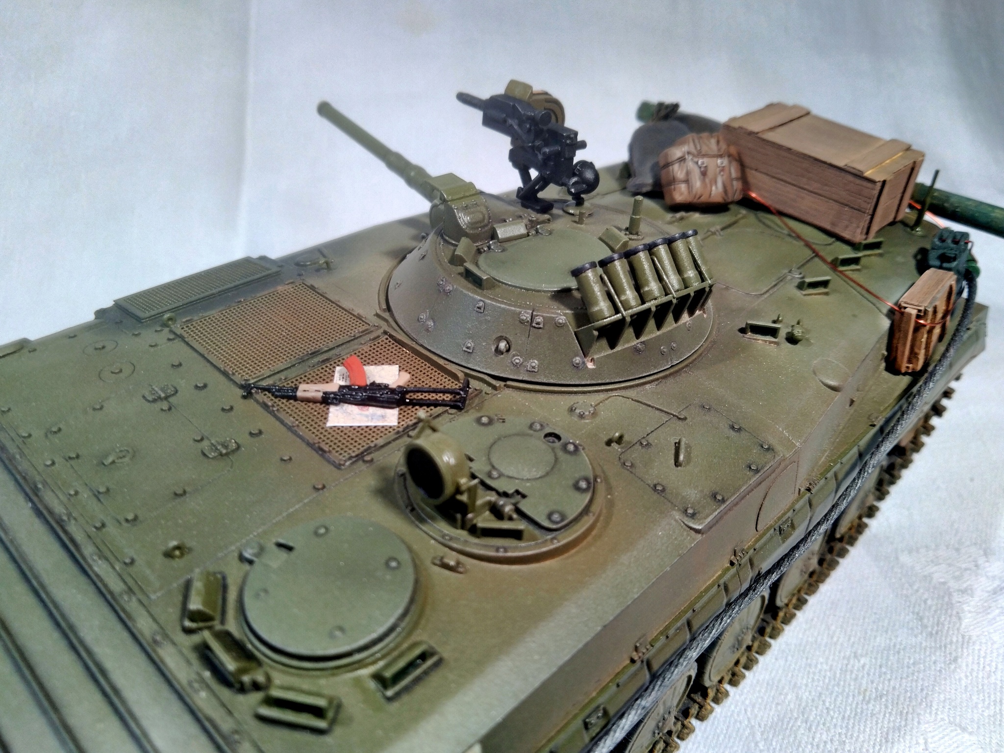 Модель - Trumpeter, химия и пигменты - Tamiya, MIG, Mr.Hobby, AK, Wilder. Дополнения (танковый трос, ящики, мешки, канистра, рюкзак, карты, АГС-17 и АКМС) - "Звезда", ICM, ZIP-maket, "Танк", ТСА. Бревно - палочка для суши. Прототипа не имеет, историческая привязка - ОКСВА, 1980-е.