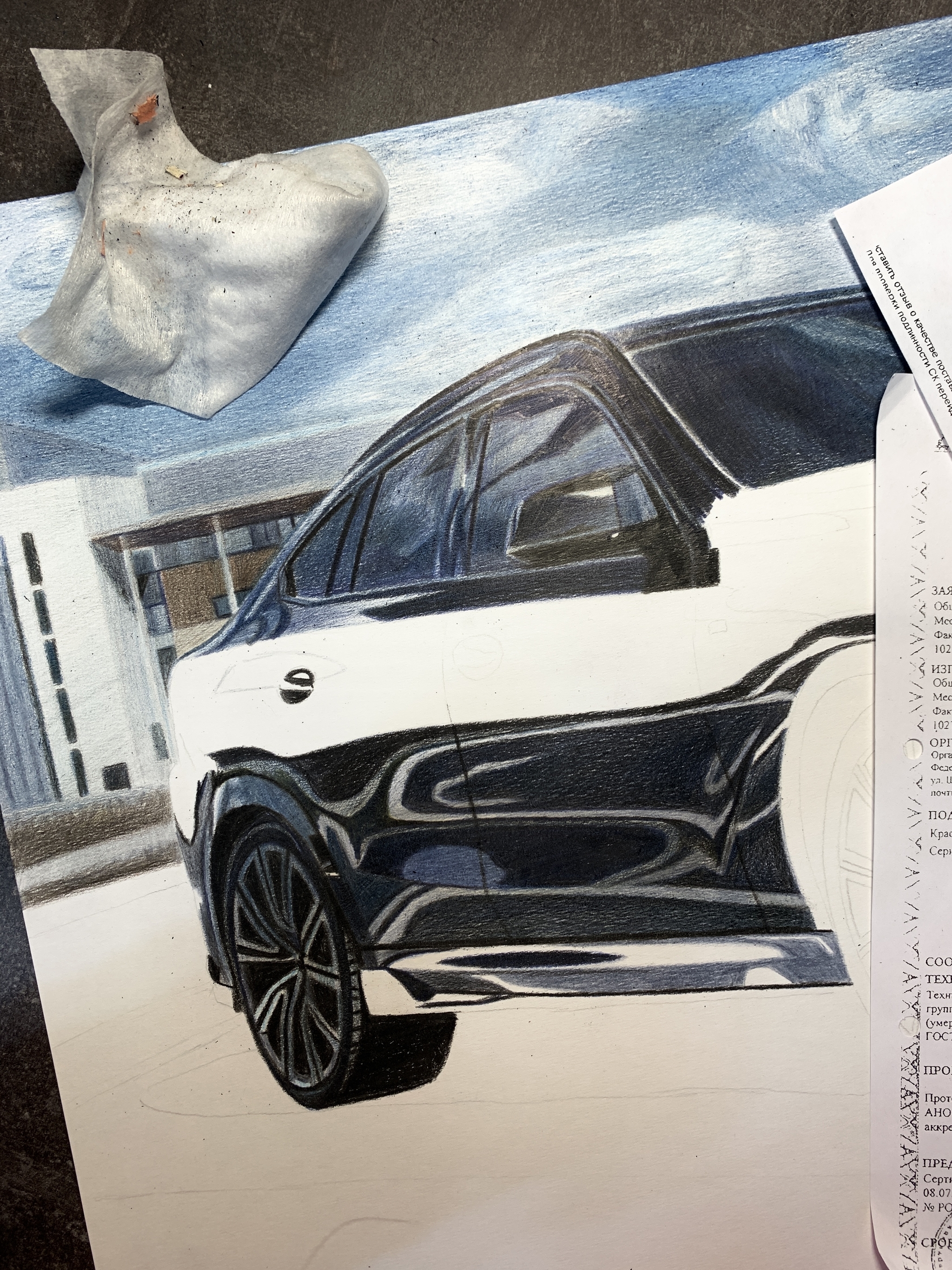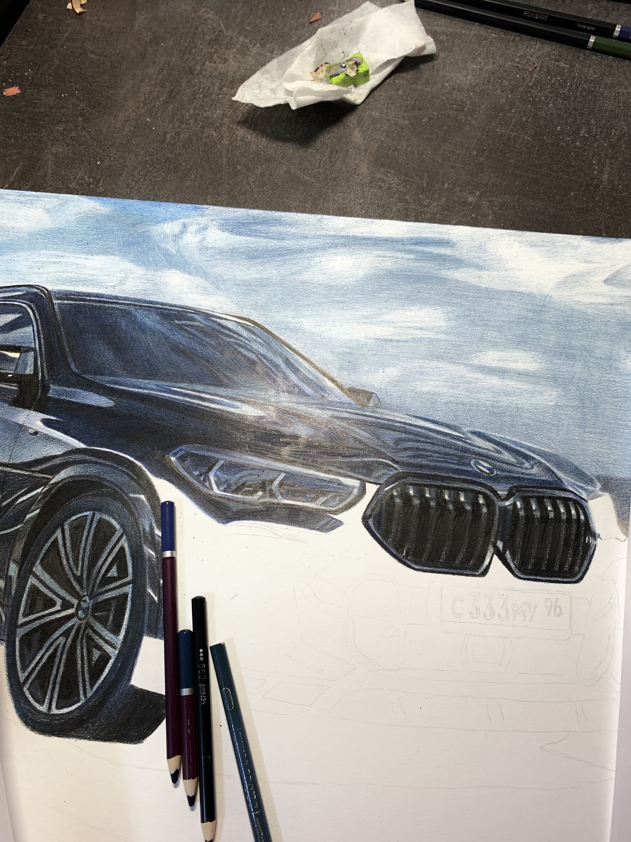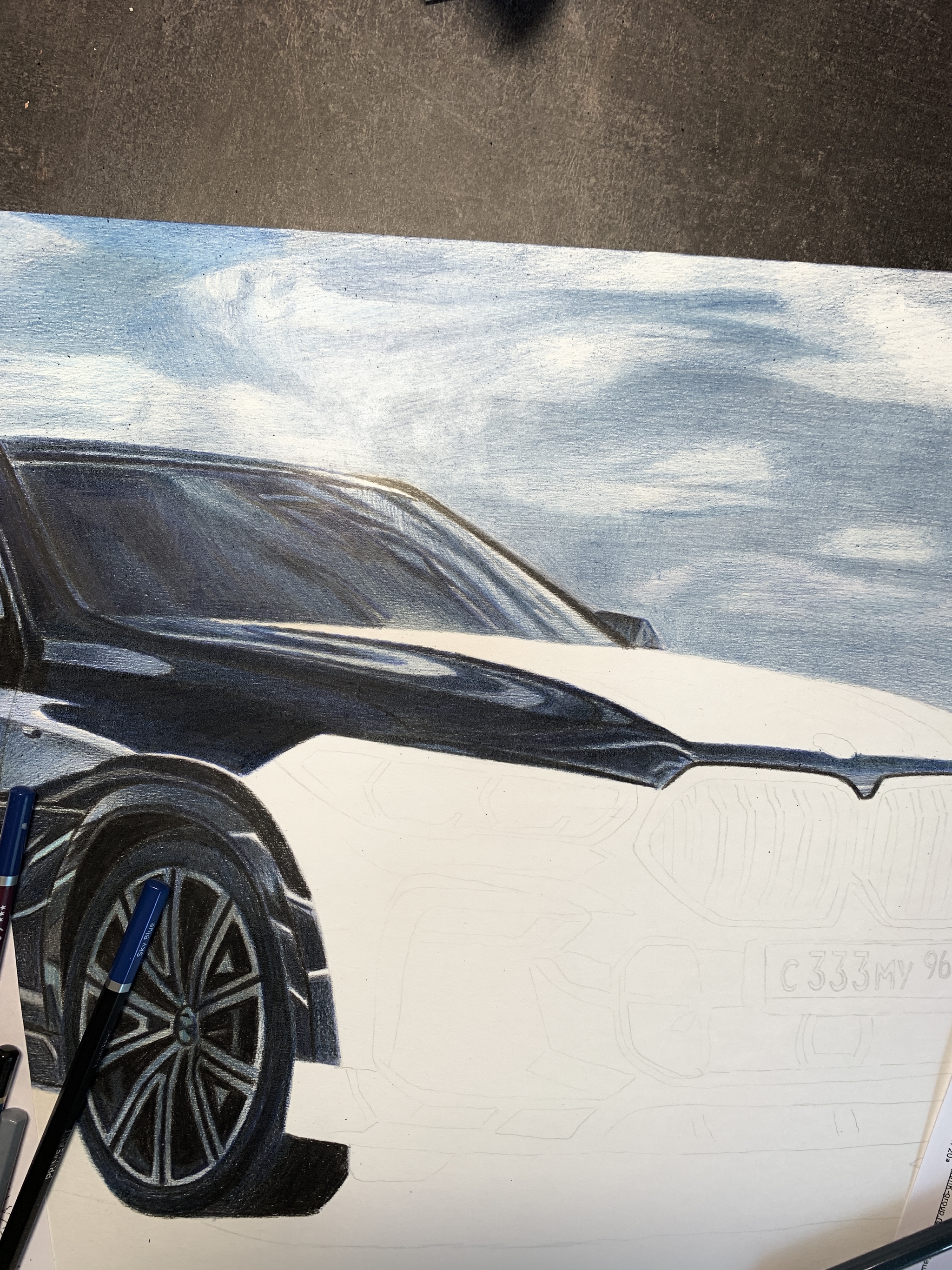 Тяжко выдался процесс, кузов непростой, много переломов и переливов на них, а ещё бесит рисовать облака, я их никогда не любила штриховать 😁😁