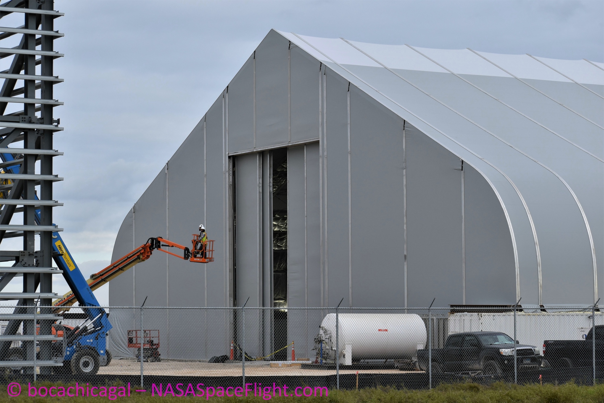 Большая палатка-ангар - полностью готова, было сделано 2 двери шириной 12 метров [2-е фото]. Внутри идёт окончательная сборка частей бака прототипа.
