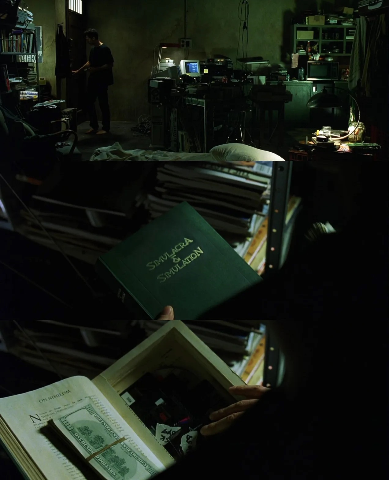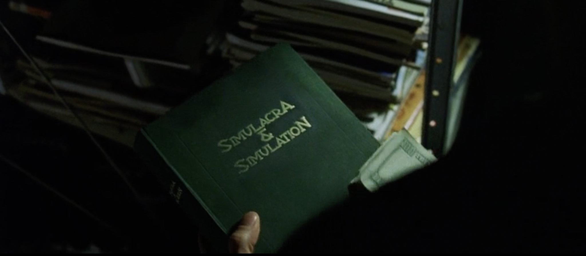 В начале фильма Томас Андерсон, известный также как Нео, прячет свои «диски» в вырезанную книгу, и камера как бы невзначай задерживается на заголовке. Но не обольщайтесь — перед нами не подлинник философского трактата, а бутафория. И это, конечно, идеально по Бодрийяру: книга, как и сама Матрица, притворяется чем-то большим, чем является. Ведь настоящее издание — тоненькое, примерно 200 страниц, — и не предназначено для того, чтобы в нем можно было что-то прятать.