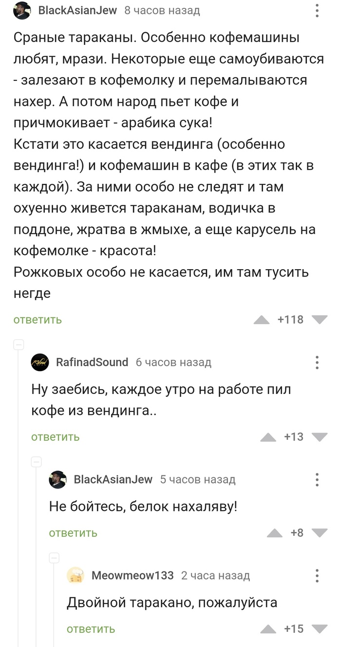 2261 Apool 3 года назад Бодрящий кофе1 Комментарии Комментарии на Пикабу Скриншот Тараканы Кофе Длиннопост Юмор 43 7 7 4 3 Ещё 0