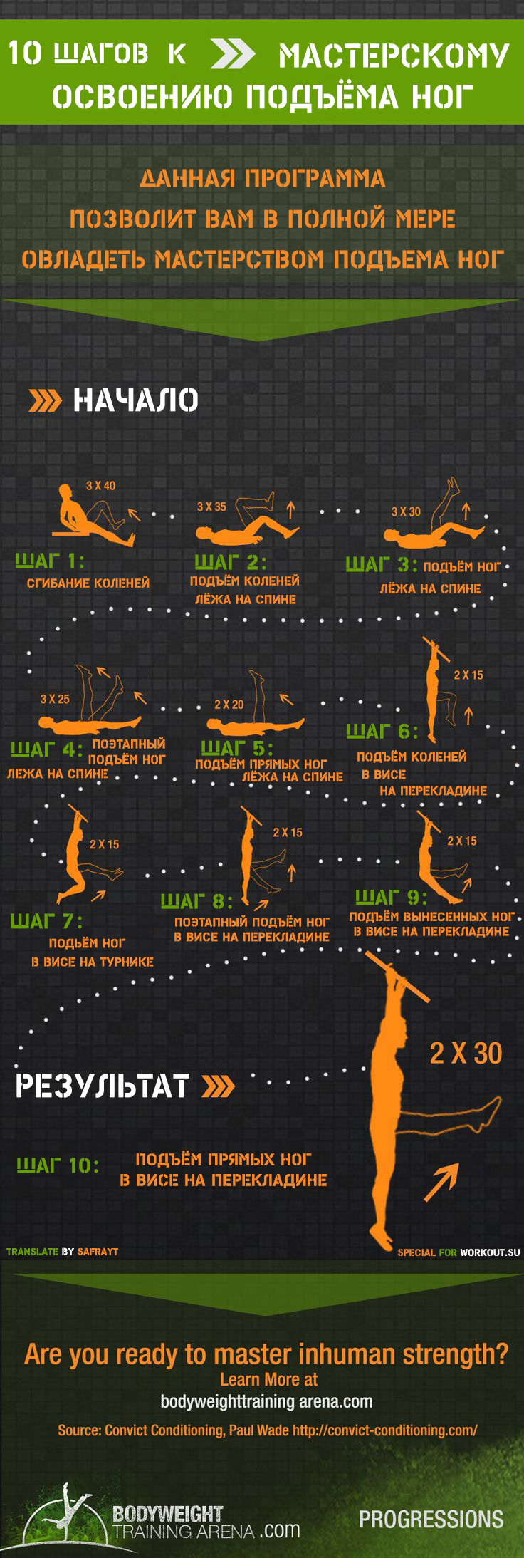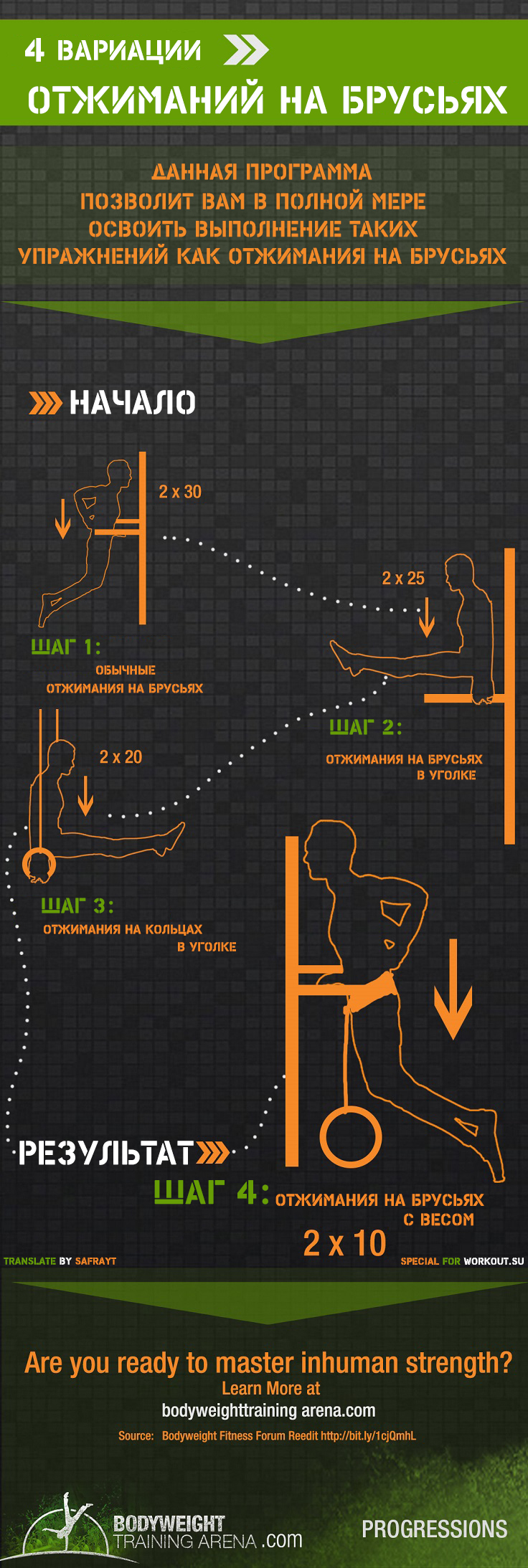 в отжиманиях сначала надо отжиматься от стены а вот в брусьях первым делом советуют сразу бахнуть 2 раза по 30. есть информация, что это чуть сложнее отжиманий от стены