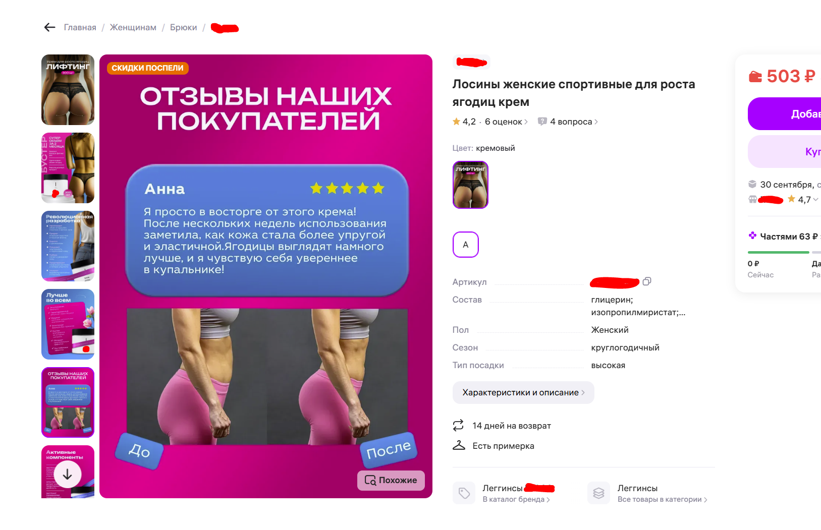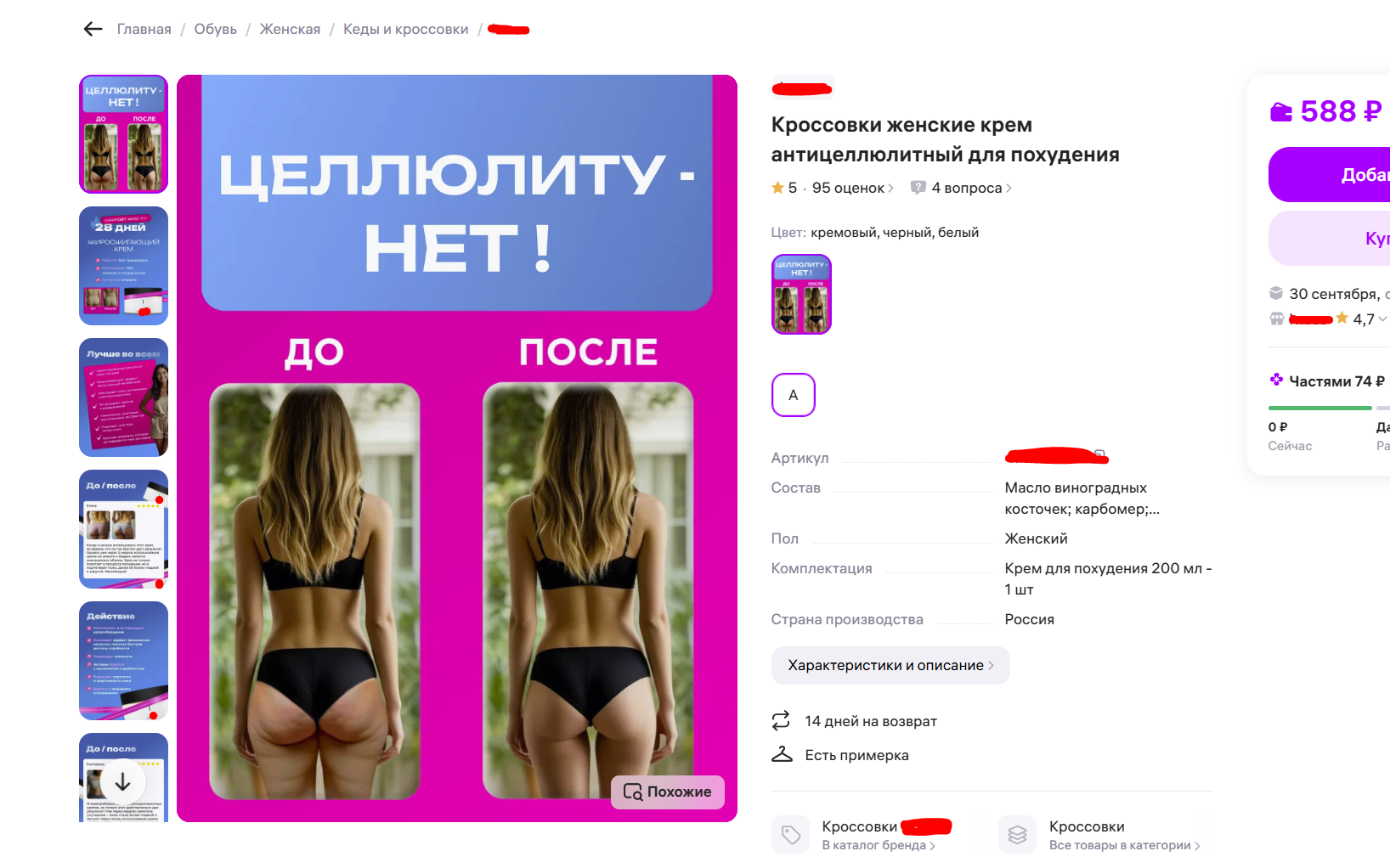 Ловко они придумали! Заходит тётя на маркетплейс за кроссовками, чтоб наконец в зале или на пробежке свой жир растрясти, а тут хоба и крем! 588 рублей 14 ( ЧЕТЫРНАДЦАТЬ КАРЛ!) дней и жопа как орех! И напрягаться не надо, в зале или на дорожке потеть, ешь тётя дальше свои пончики сколько хочешь и натирайся кремом!