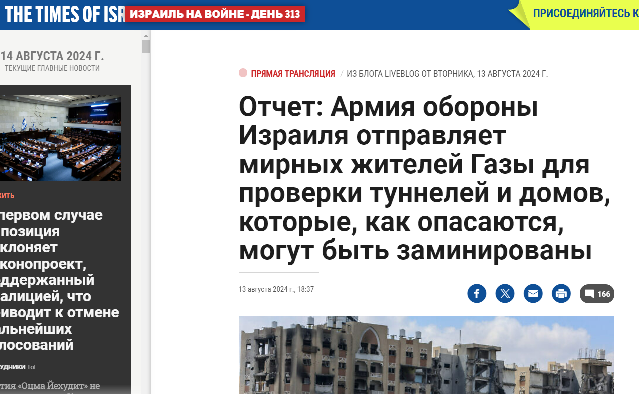 Газета Haaretz сообщает, что Армия обороны Израиля использует мирных палестинцев в качестве живого щита во время операций в секторе Газа, приказывая им заходить в туннели и дома, которые, по опасениям армии, могут быть заминированы.