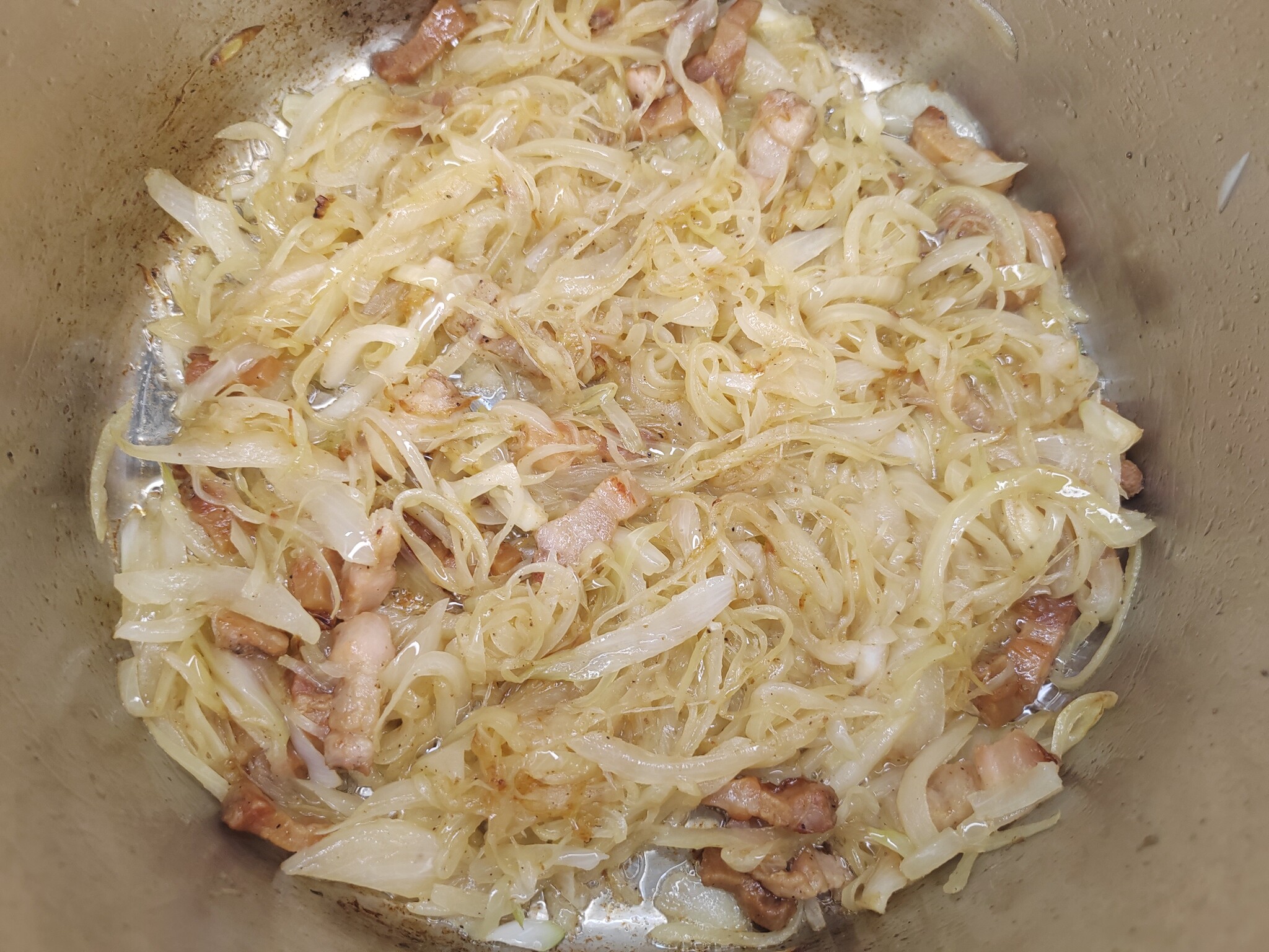 13. После чего лук с краёв перемещаем на мясо и пытаемся мясо хотя бы чуть-чуть прижарить. Крайне вдумчиво следим за тем, чтобы лук не сгорел нафиг.