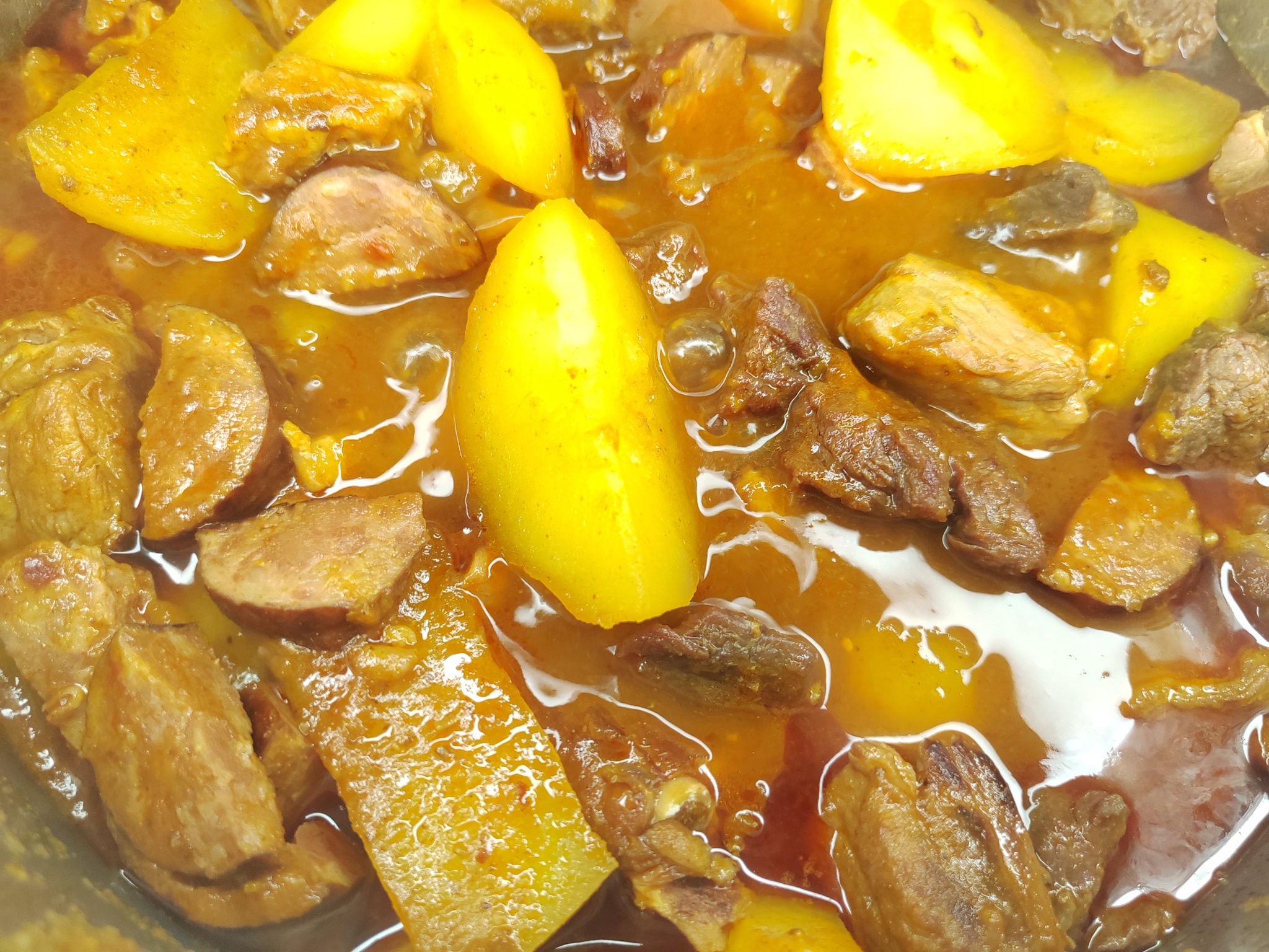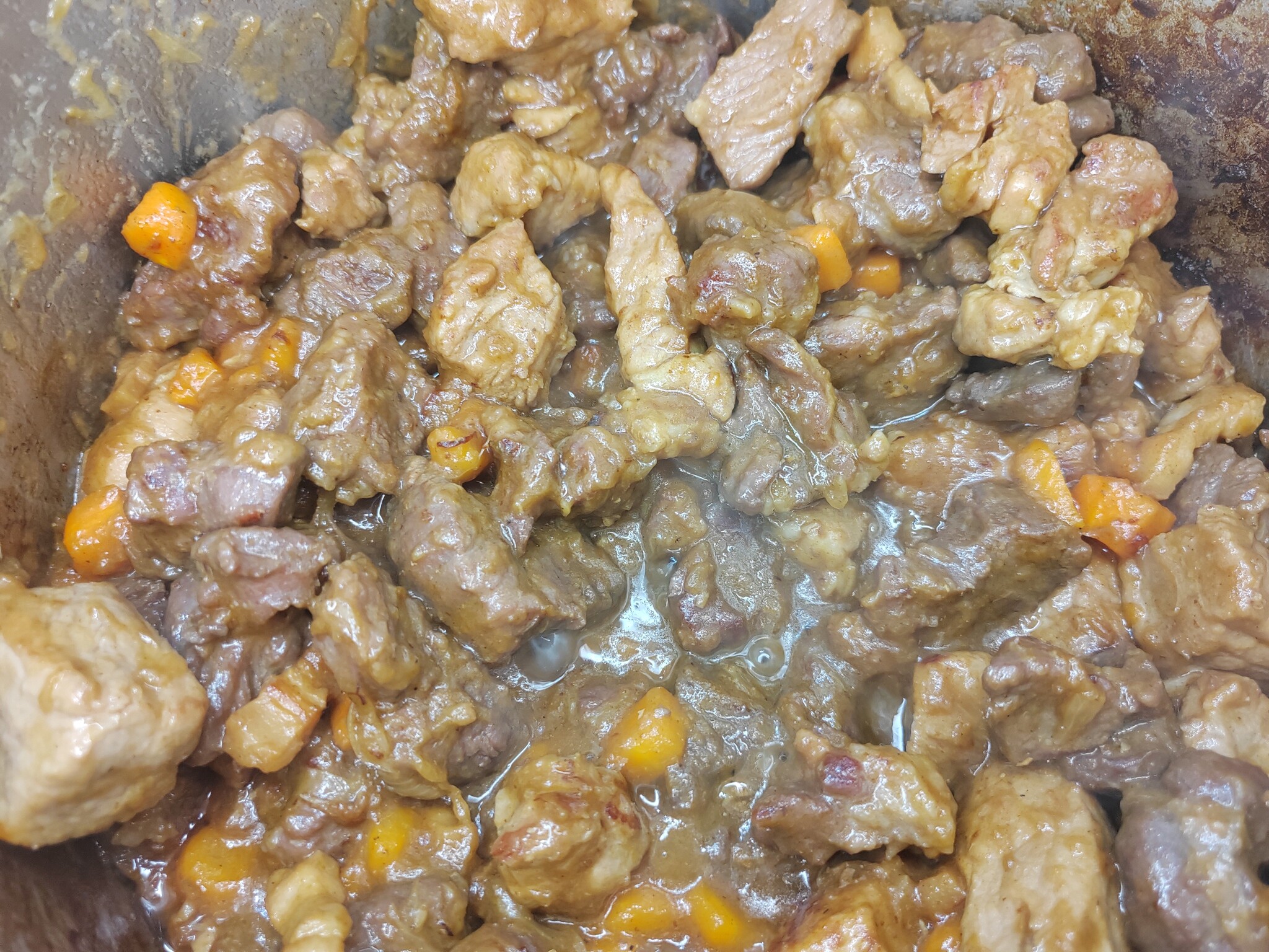 19. Ребра с колбасой туда же. Перемешиваем и тушим/жарим. Внимательно следим за тем, что происходит на дне кастрюли - в месиве довольно много сахара из лука, так что оно может пытаться пригорать - так что, периодически ворошим содержимое кастрюли. Если начало пригорать, можно налить немного воды и деглазироватть все признаки нафиг. Где-то в этот же момент можно поставить кипятится чайник, чтобы был запас горячей воды. Необязательно, но так будет удобнее.