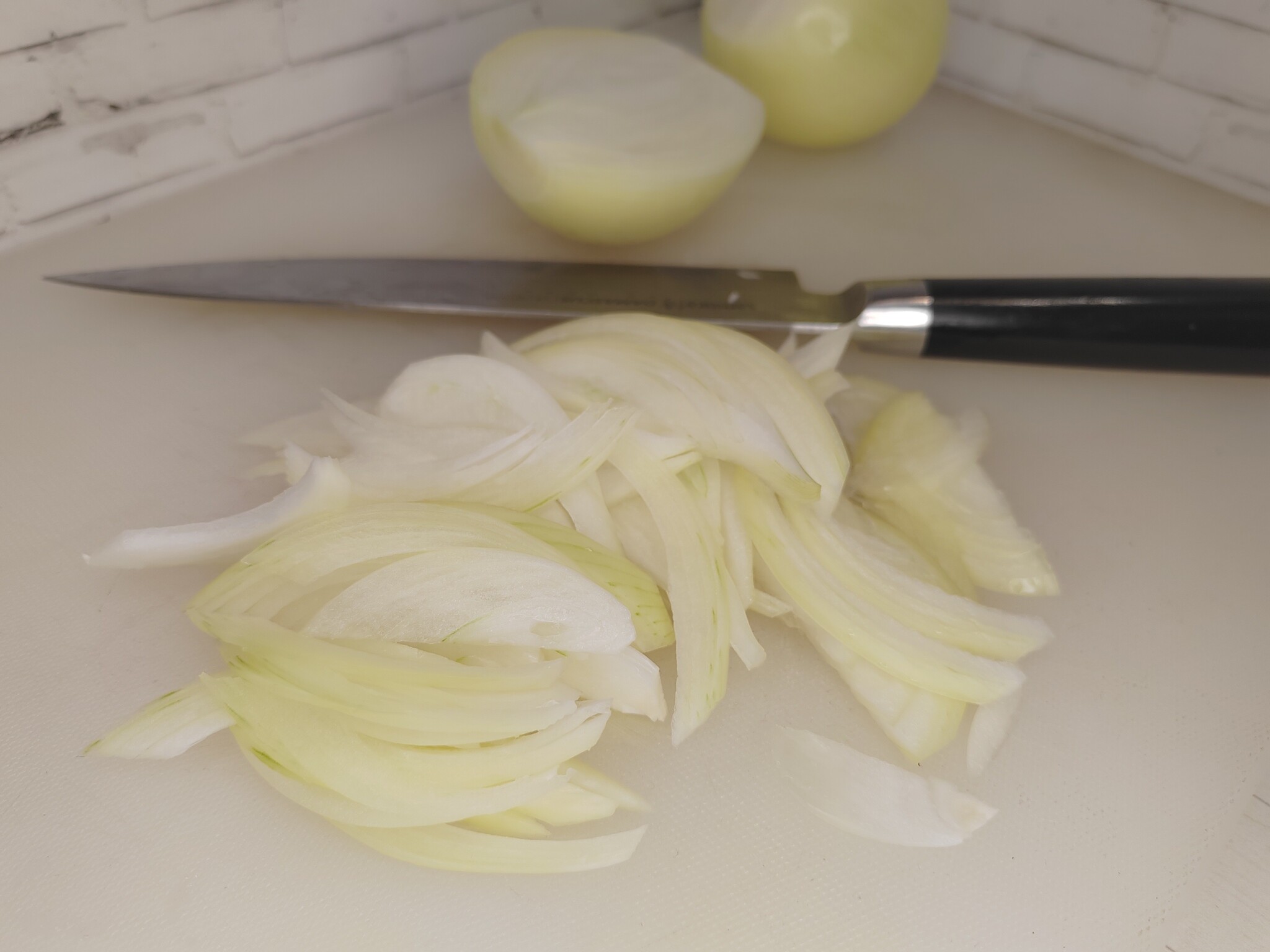 2. Шинкуем лук. Как-нибудь. Я, по-привычке, перьями.