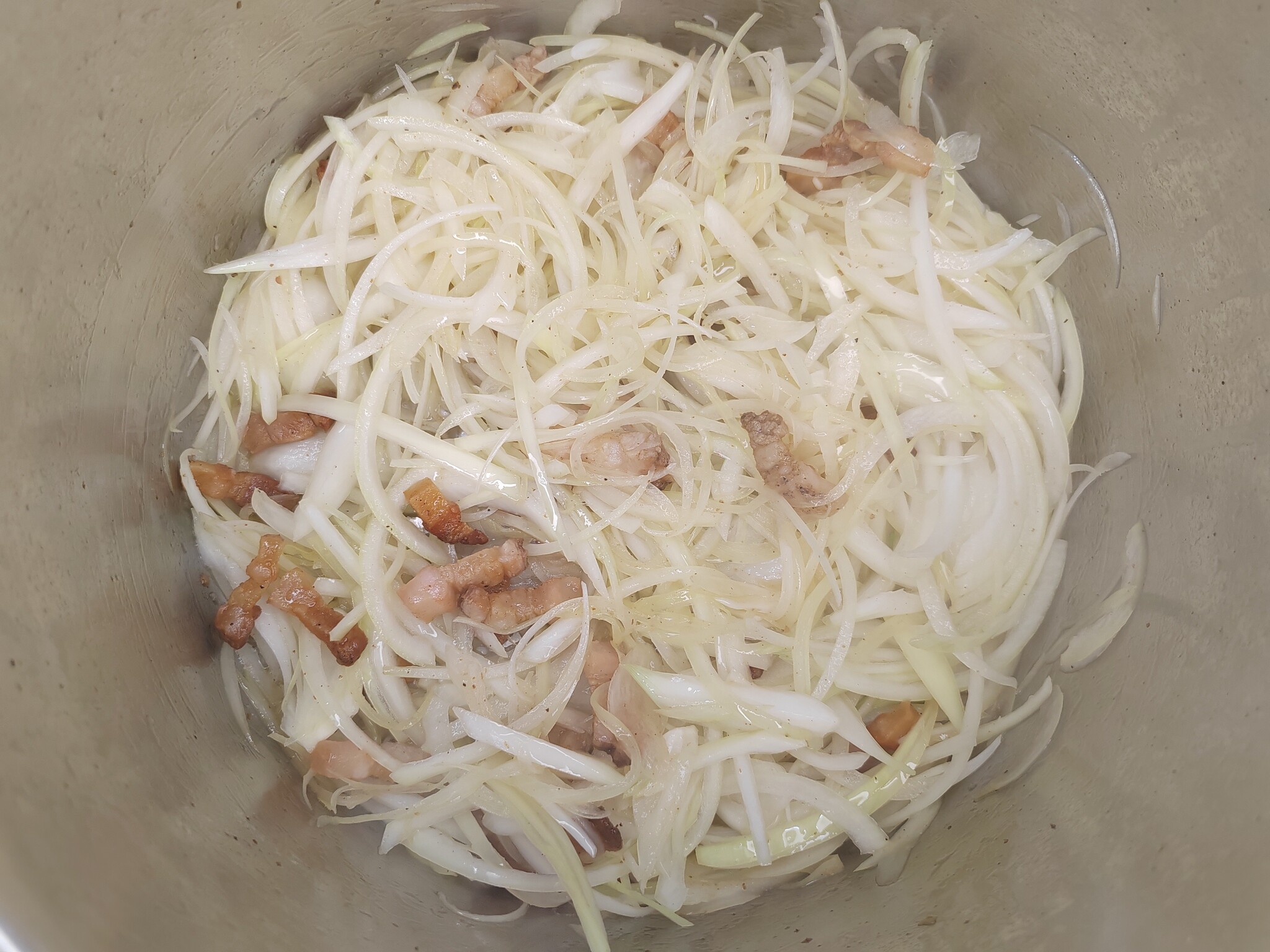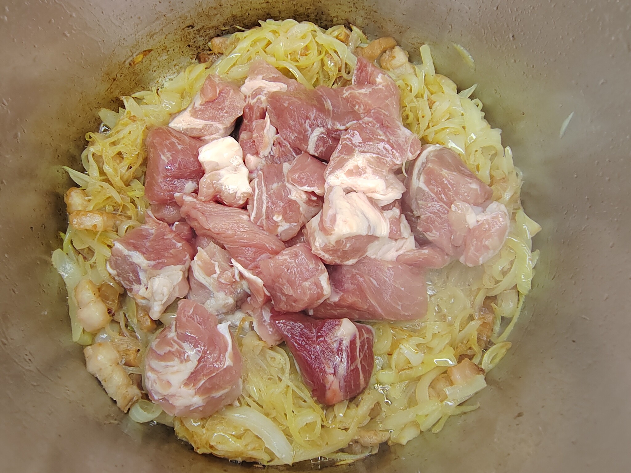 12. Сдвигаем лук к краям, делаем огонь почти максимальным и бахаем в кастрюлю сырую свинью.
