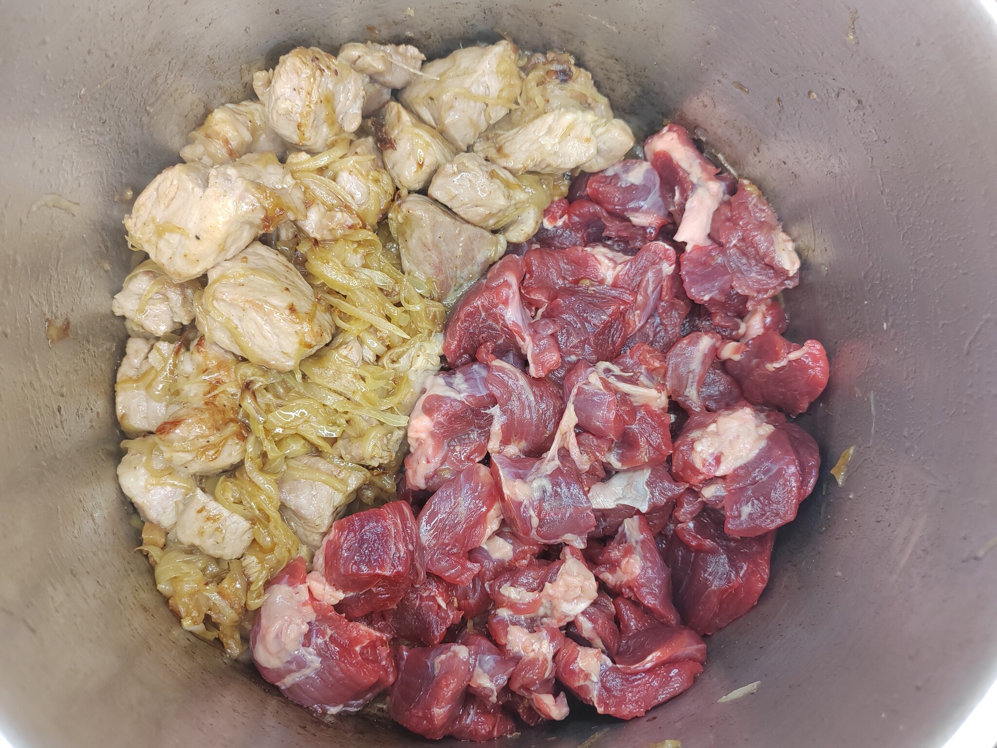 15. Сдвигаем всё в сторону и бахаем в кастрюлю говяду.