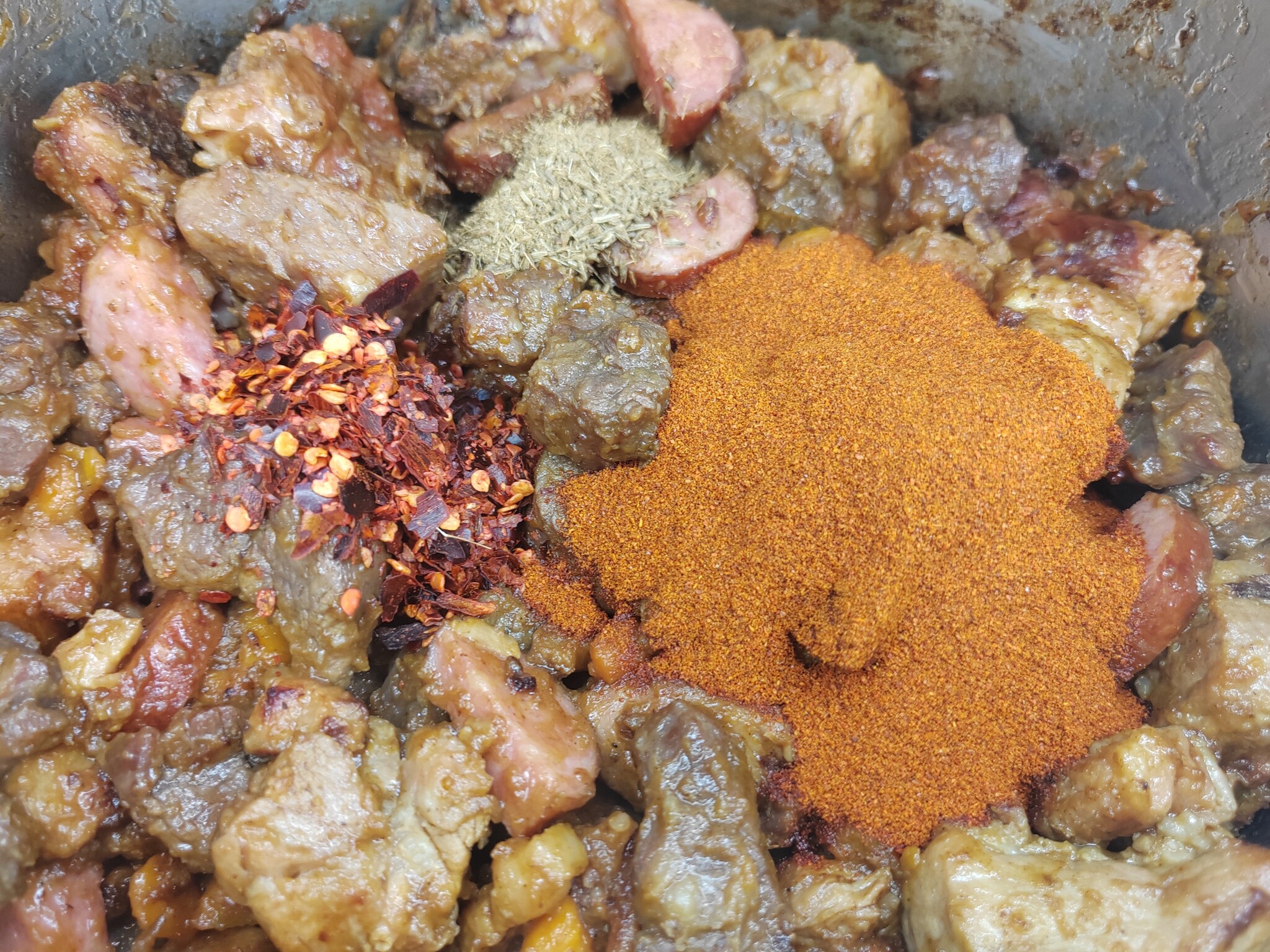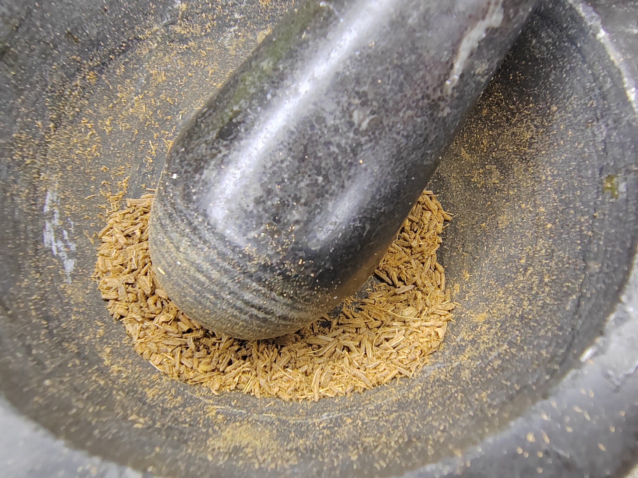 20. Растираем в ступке тмин. Где-то когда-то я слышал, что растирание в ступке позволяет раскрошить растирание, чуть ли, не до молекулярного уровня. Тмин об этом, видимо, не в курсе. Но, тем не менее, растираем. А ещё отмеряем паприку и острый перец.