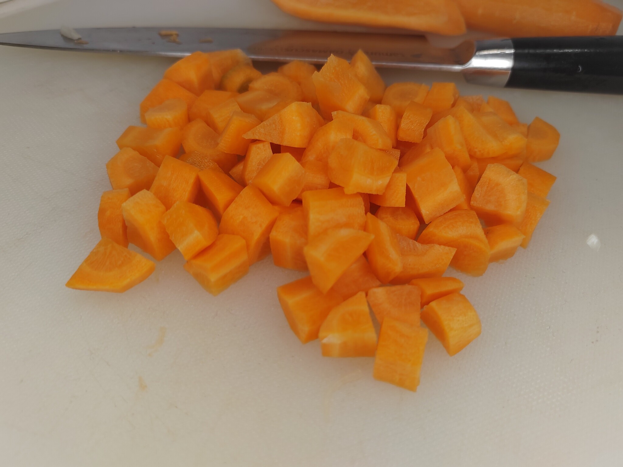 7. Ну и моркву режем. Я пошинковал кубиками околооливьешного размера, но можно и крупнее.