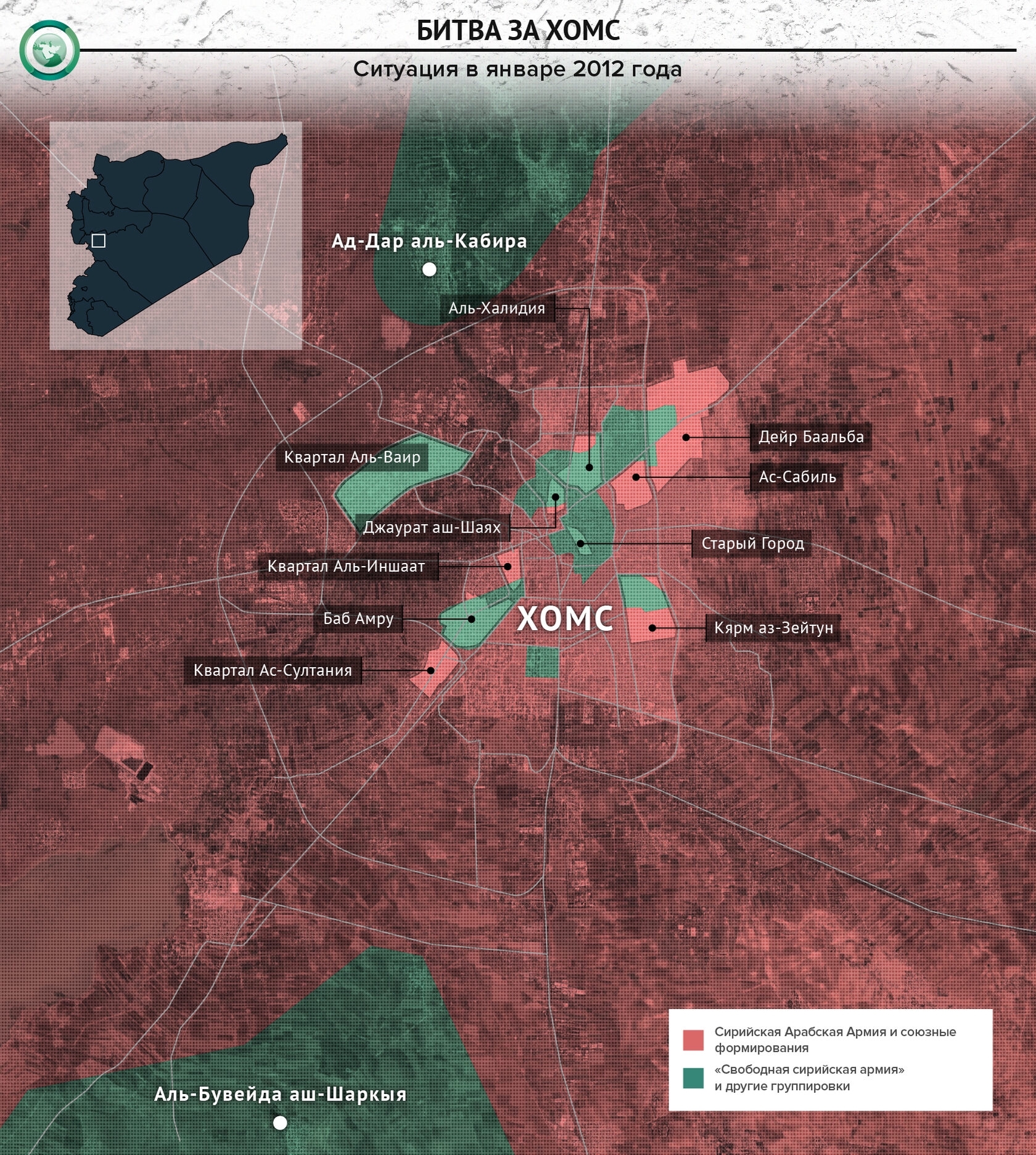 Несмотря на попытку деэскалировать насилие в Хомсе со стороны Лиги арабских государств (ЛАГ), в январе 2012 ситуация в городе начала принимать крайне опасный оборот. 23 января представители командования Сирийской Арабской Армии сообщили журналистам, что боевики ССА взяли под контроль две трети города — при этом ежесуточные потери в стане сирийской армии составляли от 4 до 5 убитых и от 10 до 50 раненых солдат и сотрудников службы безопасности.