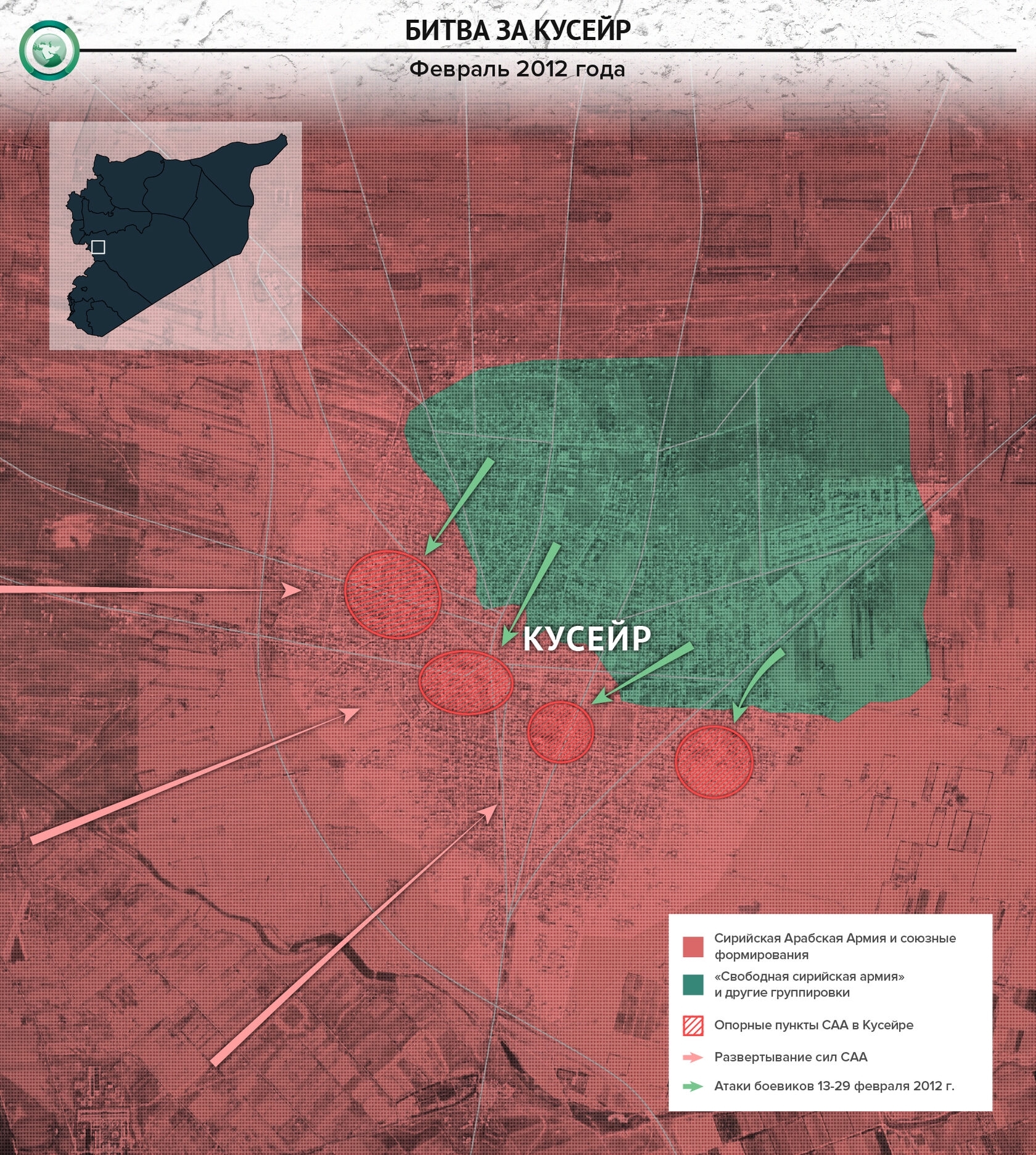 В феврале 2012 года начались ожесточенные бои в Кусейре — южном пригороде Хомса: через этот населенный пункт проходили маршруты контрабанды оружия из Ливана. Кроме того, через него в САР нелегальным образом попадали журналисты западных СМИ, которые освещали события гражданской войны в Сирии. 13 февраля боевики ССА захватили здание органов безопасности, убив 5 сотрудников военной разведки. После нападения боевики забаррикадировались в доме, поскольку в город начали стягивать бронетехнику от Хомса, плюс еще 400 солдат могли в любой момент нанести удар со стороны городской администрации.