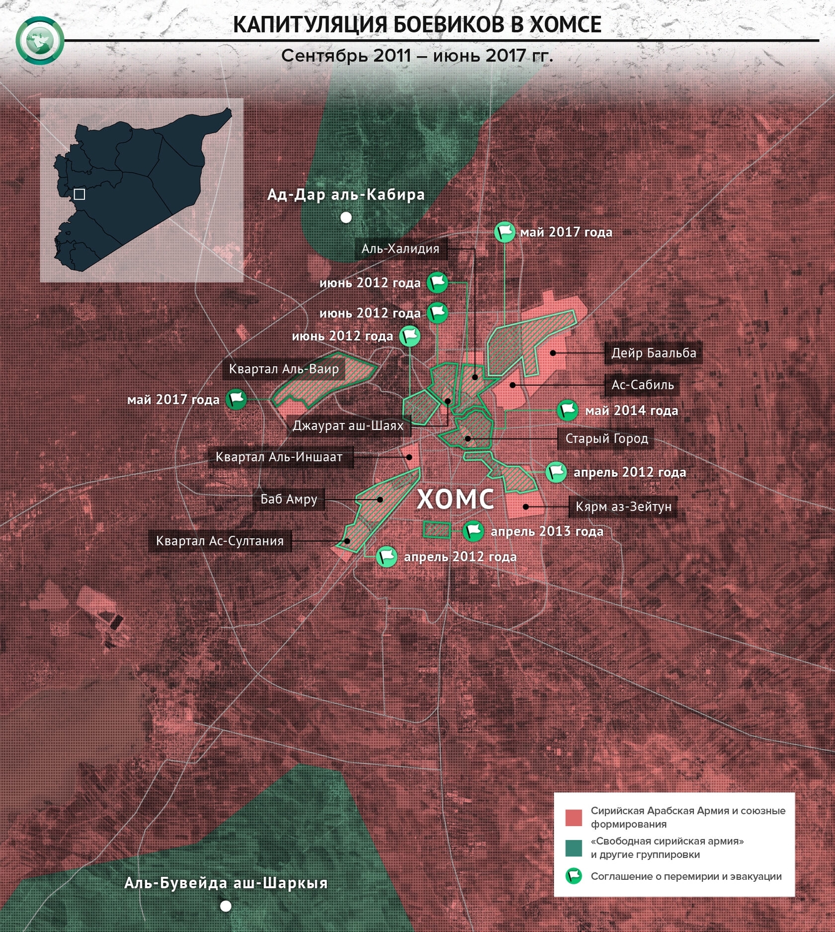 Развязка наступила в мае 2014 года: оставшиеся силы боевиков обратились к сирийской армии с предложением о мирной сдаче позиций в обмен на вывоз в Эр-Растан. Официальный Дамаск и боевики заключили соглашение о прекращении огня и эвакуации, и уже 8 мая силы «Свободной сирийской армии» — 2 тысячи боевиков и их сторонников — покинули городские кварталы и были вывезены в населенные пункты Телльбиса, Эр-Растан и Ад-Дар аль-Кабира.