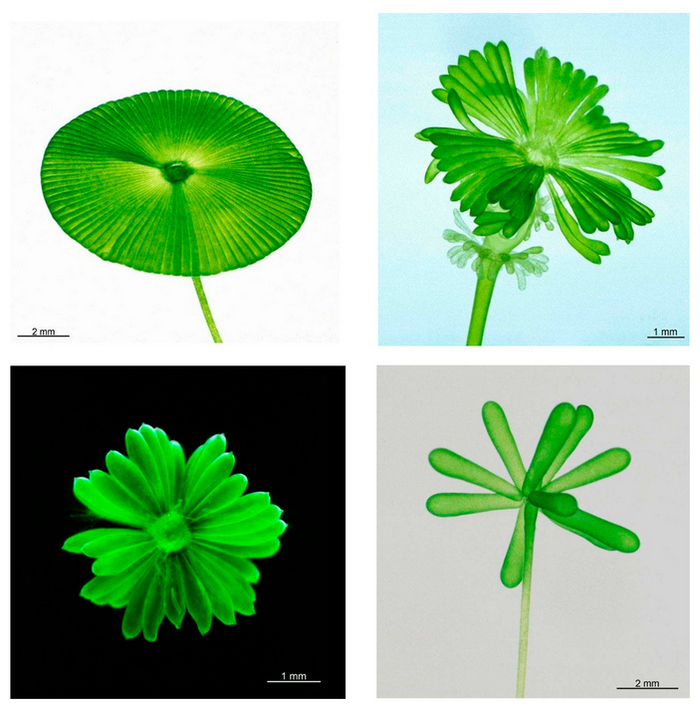 Форма шляпки различных видов ацетабулярии. A — A. acetabulum, B — A. crenulata, C — A. dentata, D — A. peniculus. Фотографии из книги S. Berger, 2006. Photo-Atlas of living Dasycladales